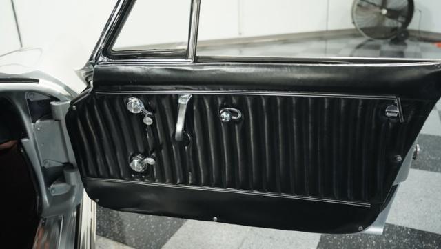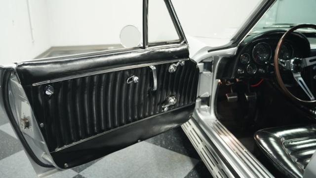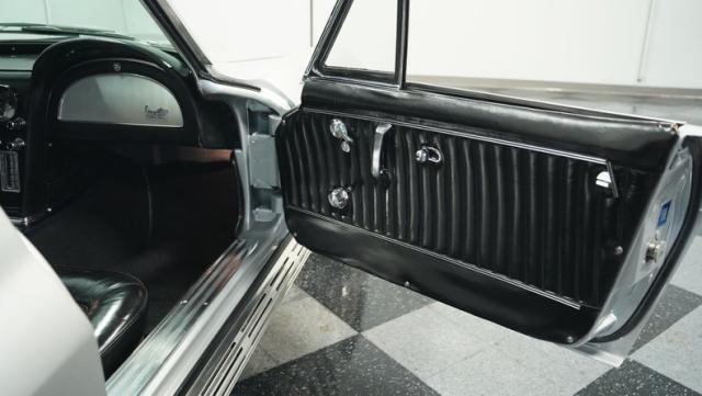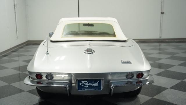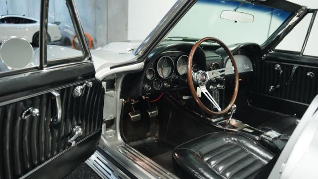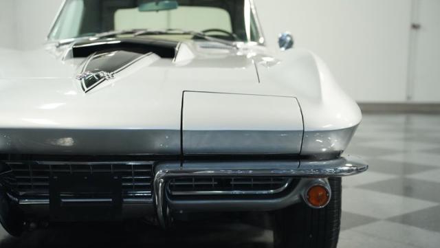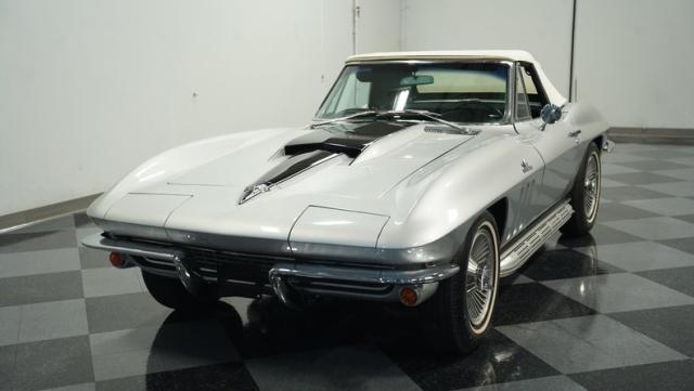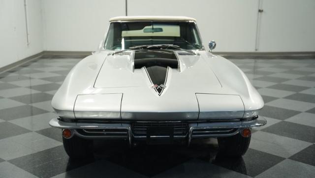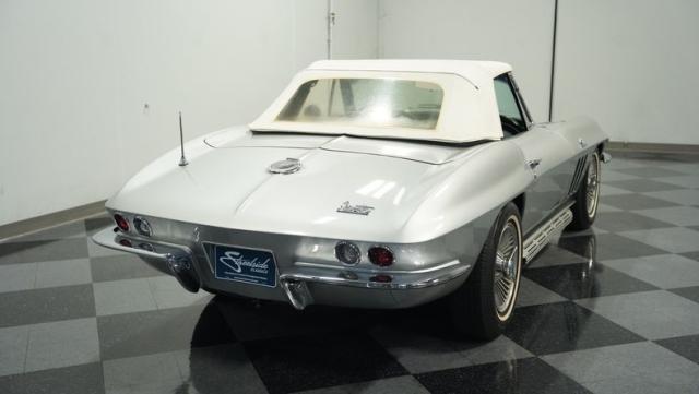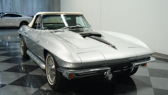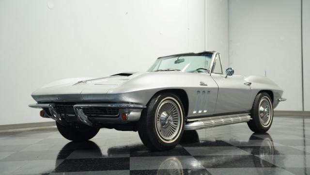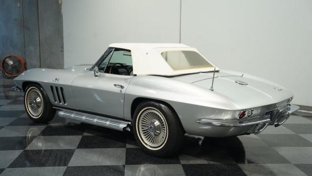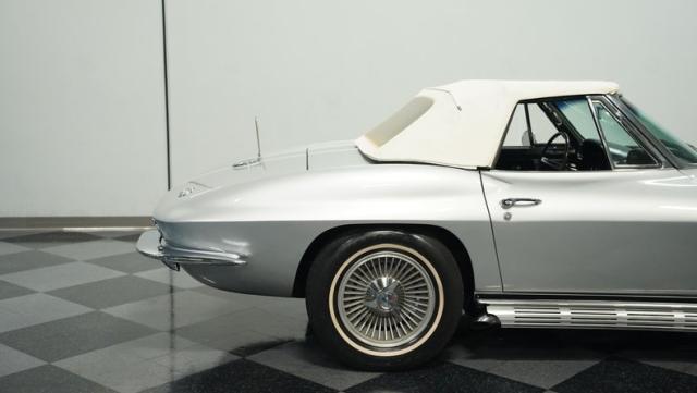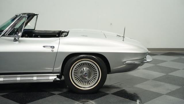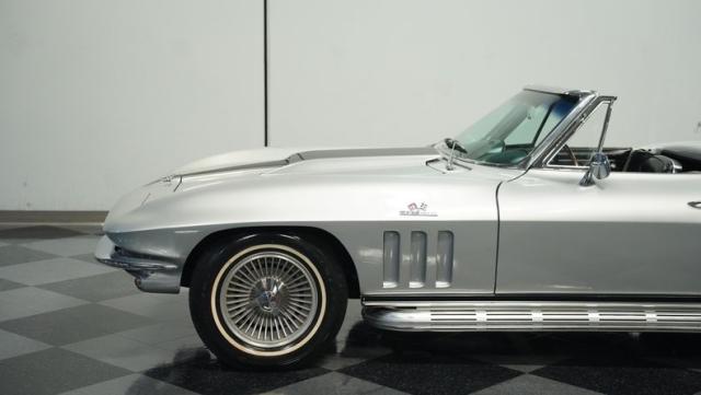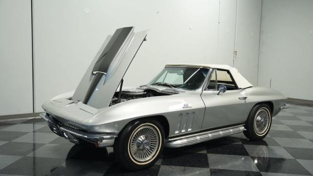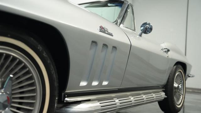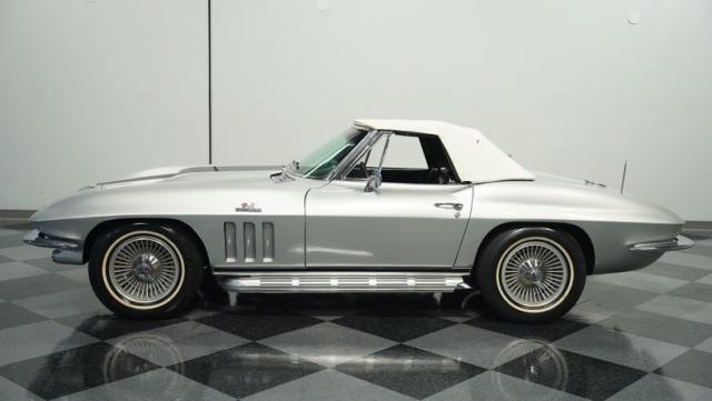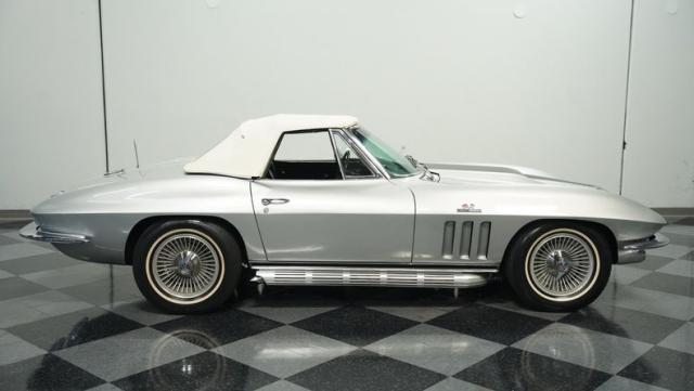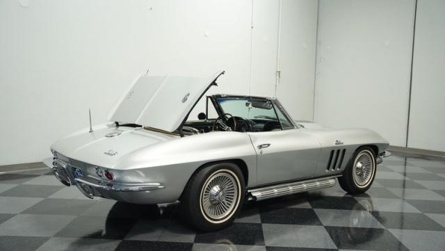 This handsome 1966 Corvette convertible is finished in a crisp Silver Pearl color accented with a black stripe that highlights a 1967 style \"Stinger\" big block hood and a white convertible top. Adding to the excitement of this classic Corvette are a set of rumbling factory-style side mounted exhaust pipes. Rolling on factory-style finned cast aluminum wheels with knock-off center caps wrapped with 215/75R15 whitewall tires, it captures a factory performance look that evokes power and elegance. The black interior features leather seats, custom upholstered door panels and dash pad, factory AM/FM radio, original wood grained steering wheel and factory gauges with large tachometer.
