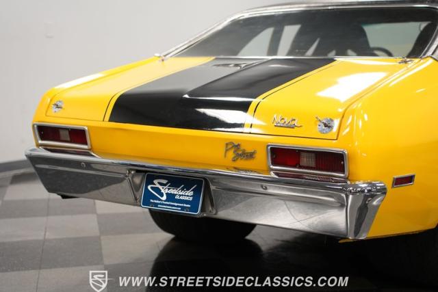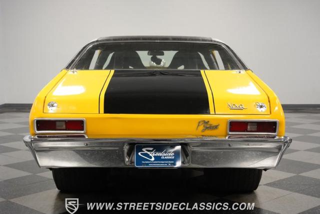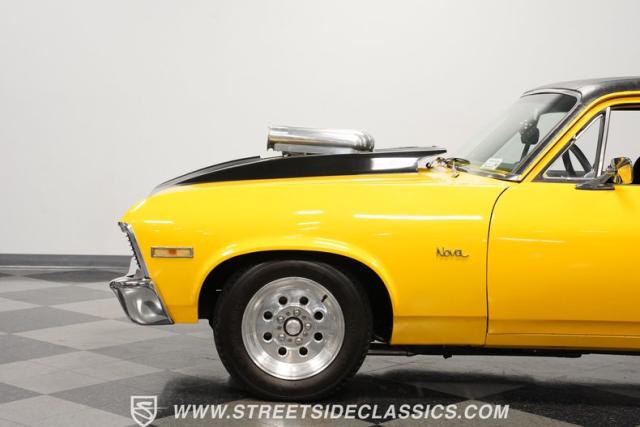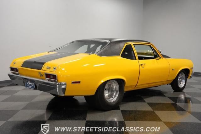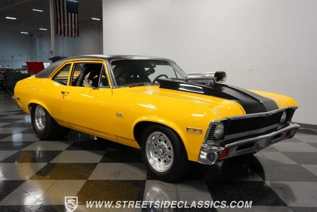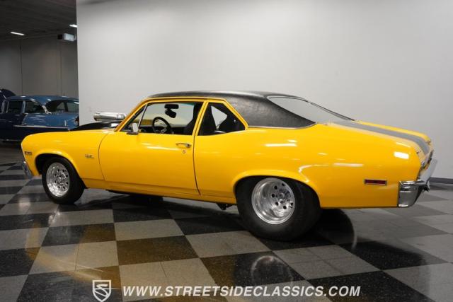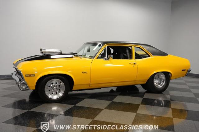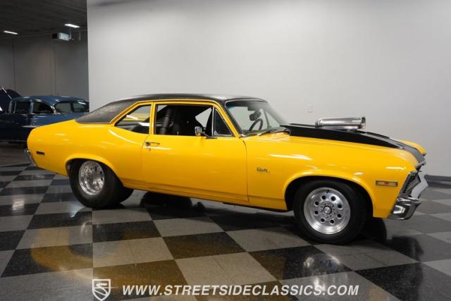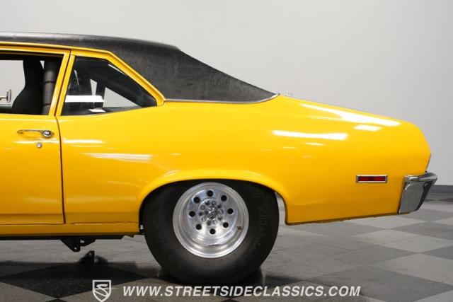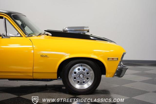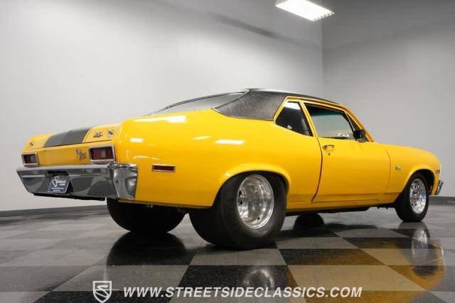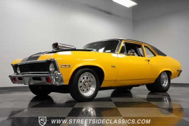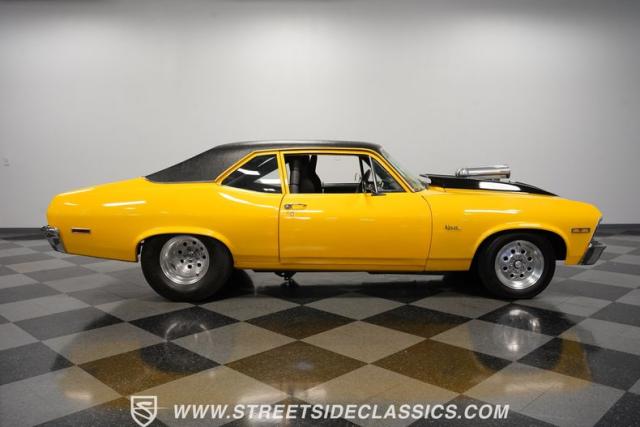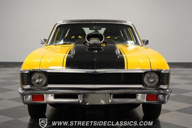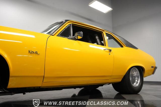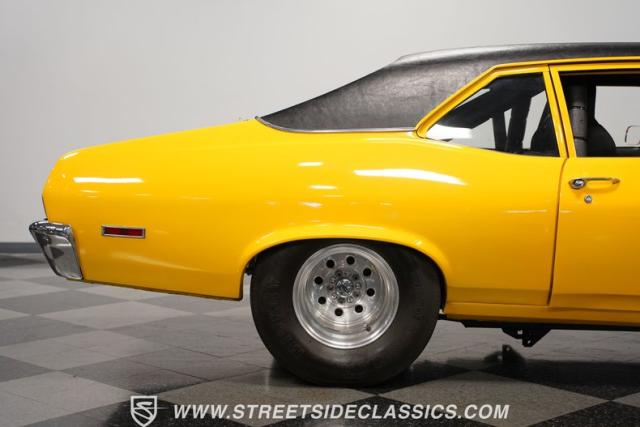 This 1972 Nova Pro Street takes no prisoners. Built by Big Al\'s Toy Box, its yellow paint and black war stripes announce pure intentions - domination. The massively tubbed rear quarters swallow 31x18.50-15LT rubber wrapped around Weld Racing wheels, while skinny 26x7.50-15LT front runners point the way. A custom fiberglass hood proudly displays the 671 supercharger and dual carbs, while the removable trunk panel and full tube chassis underneath prove this Nova means pure performance.