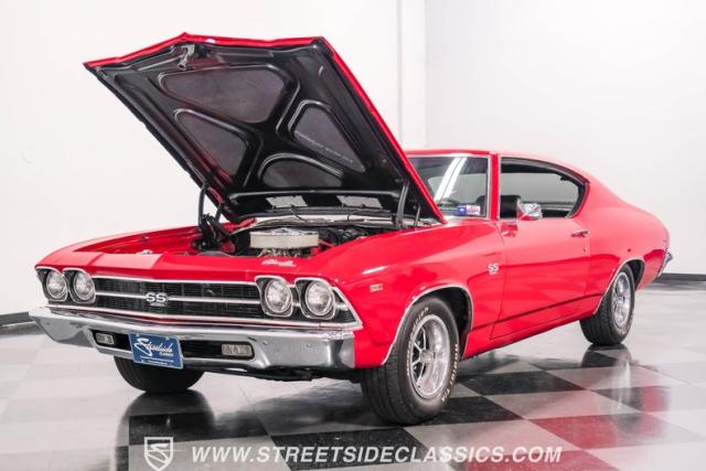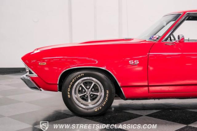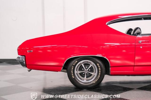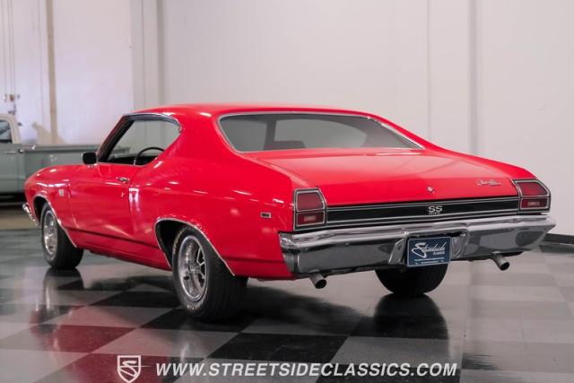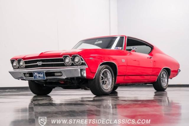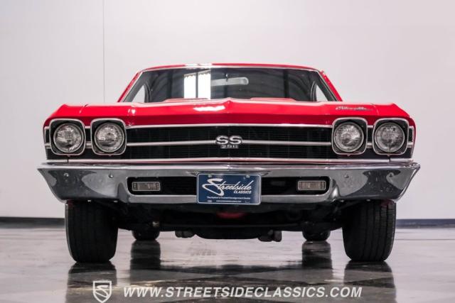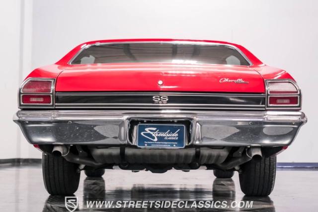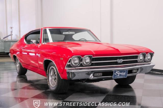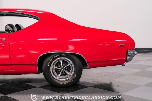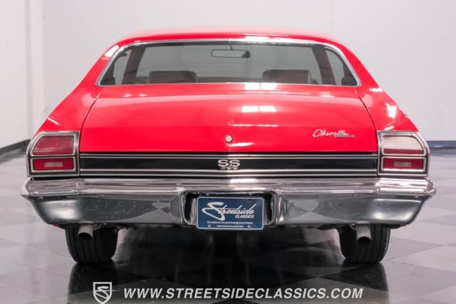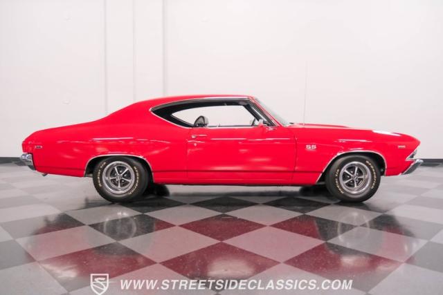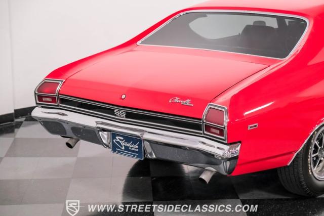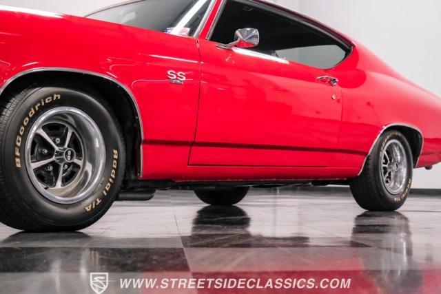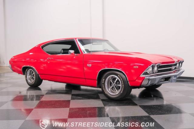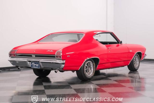 One look at the dealer invoice confirms this 1969 Chevelle is a genuine SS 396 as indicated by the Z25 code \"Group Option\". Repainted in bright red, arguably an upgrade over its original Frost Green Metallic, it radiates across every curve of this iconic A-body, creating a bold presence that defines muscle car excellence. The factory 14-inch SS wheels with beauty rings complement the stance, while BFGoodrich 225/70R14 tires anchor each corner. Chrome accents gleam against the vibrant paint, from the chrome bumpers to the window trim. Factory tinted glass and expertly applied window tinting add a custom touch to this muscular profile.