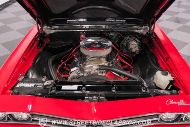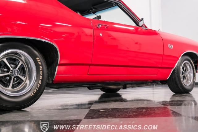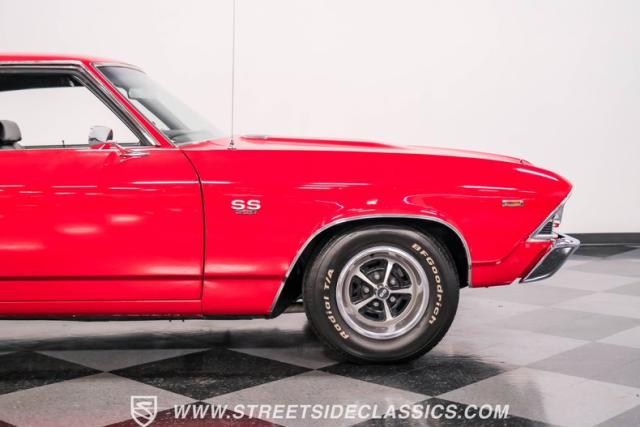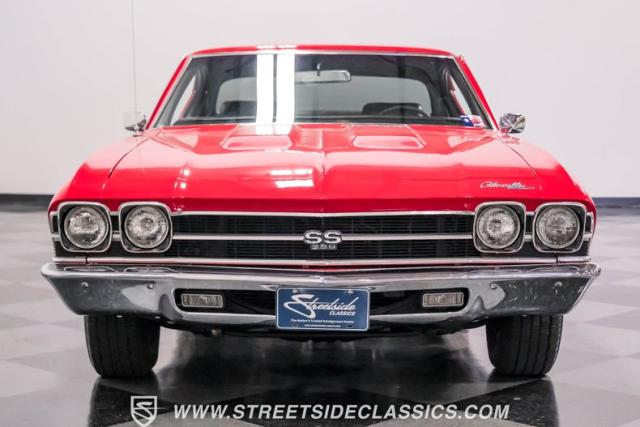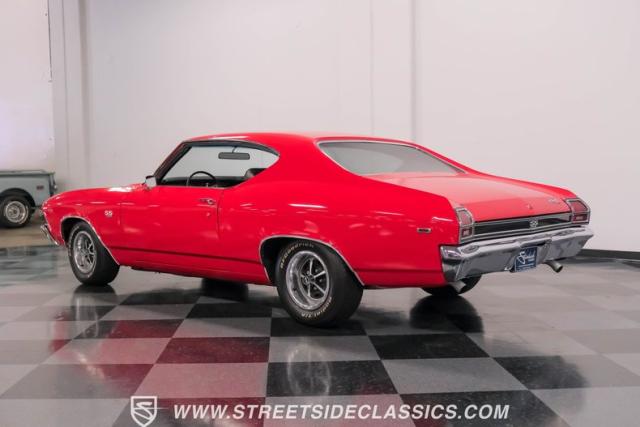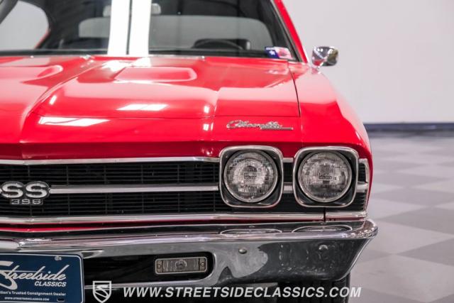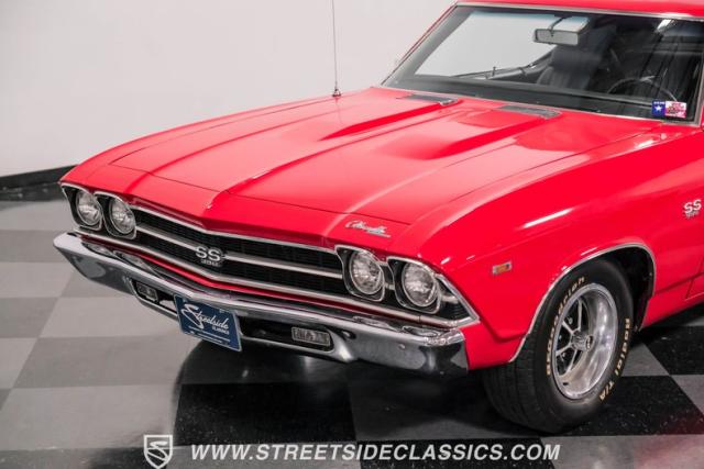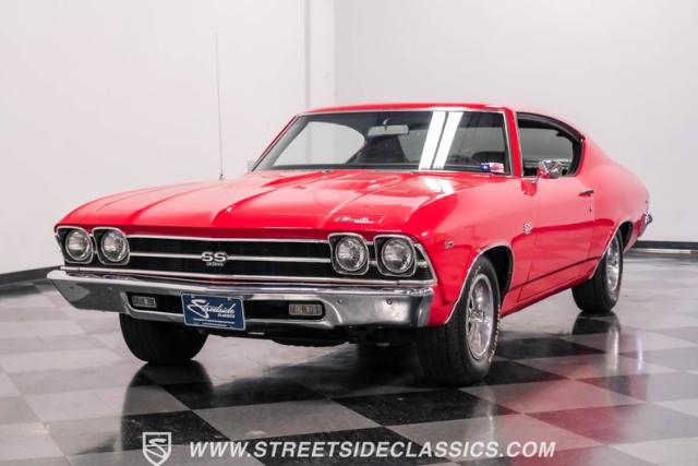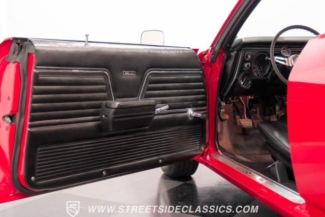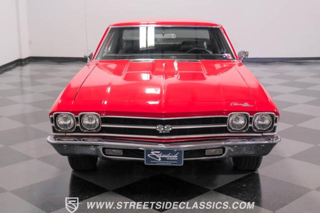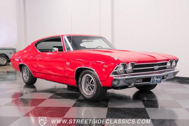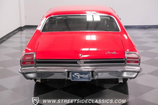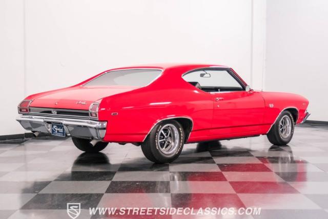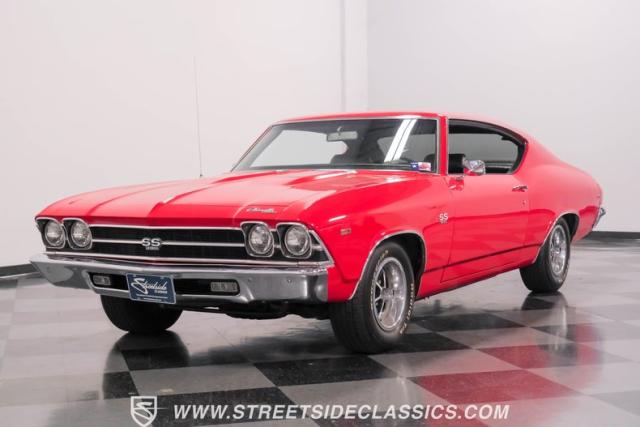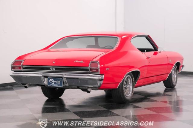One look at the dealer invoice confirms this 1969 Chevelle is a genuine SS 396 as indicated by the Z25 code \"Group Option\". Repainted in bright red, arguably an upgrade over its original Frost Green Metallic, it radiates across every curve of this iconic A-body, creating a bold presence that defines muscle car excellence. The factory 14-inch SS wheels with beauty rings complement the stance, while BFGoodrich 225/70R14 tires anchor each corner. Chrome accents gleam against the vibrant paint, from the chrome bumpers to the window trim. Factory tinted glass and expertly applied window tinting add a custom touch to this muscular profile.