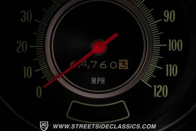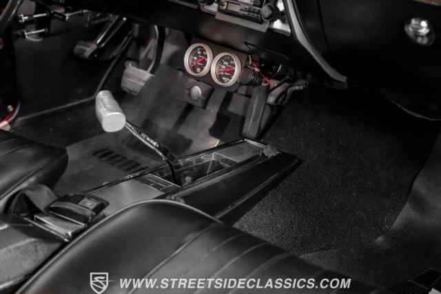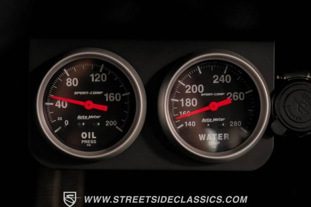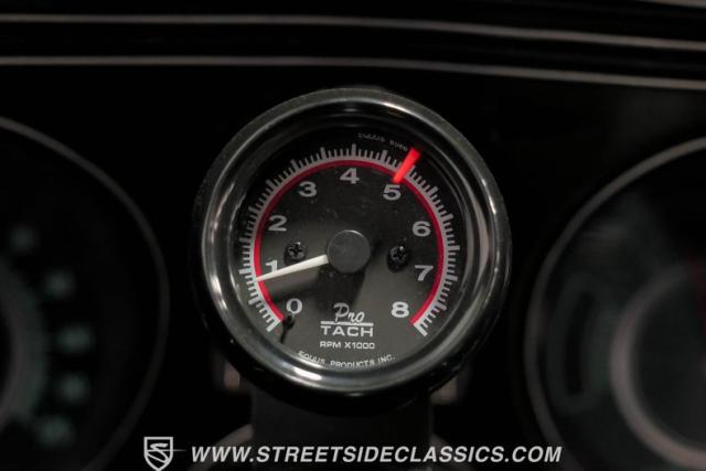 Black vinyl defines the interior\'s performance-focused design. The bucket seats and center console create a driver-focused layout, enhanced by an aftermarket steering wheel for improved grip and control. The Hurst T-handle shifter rises from the console, ready for action. AutoMeter oil and temperature gauges mounted below the dash provide vital readings, while a tachometer mounted on the steering column keeps track of revs. The AM/FM cassette stereo adds modern audio capabilities to this classic cabin.