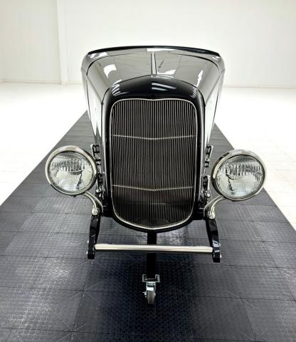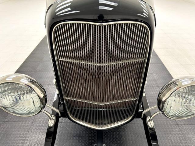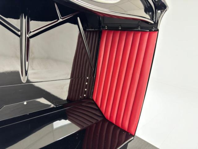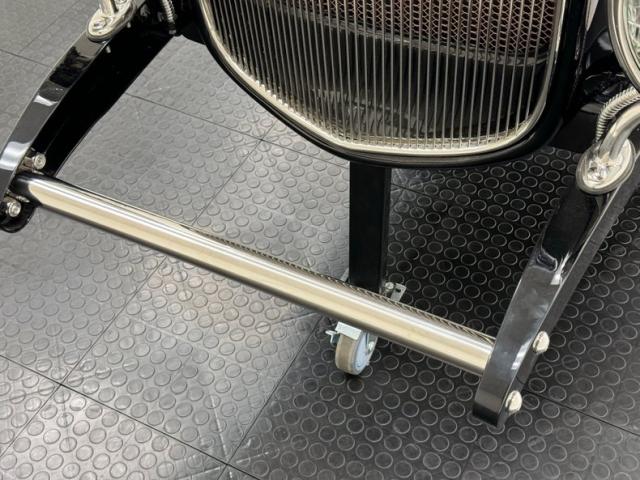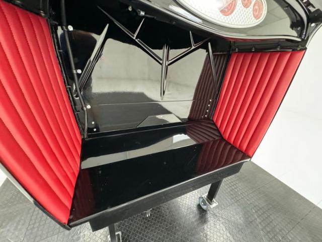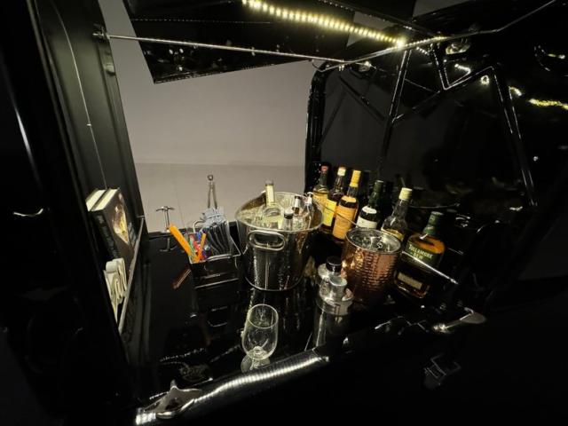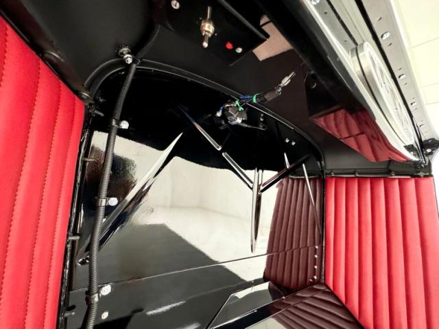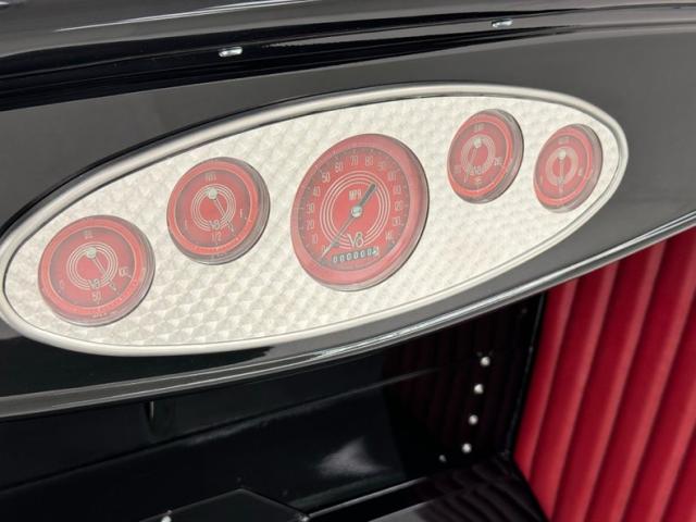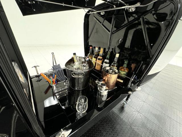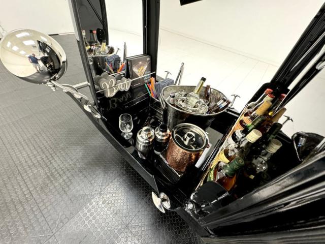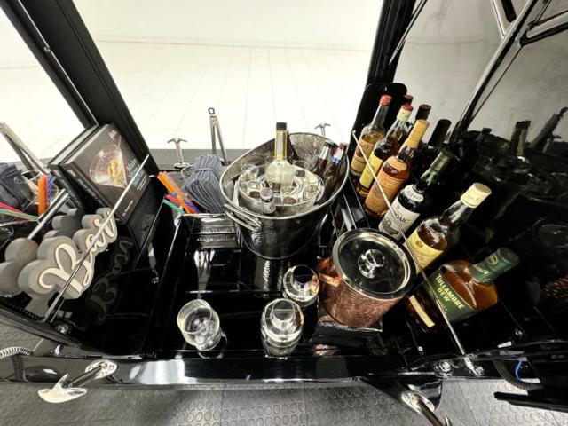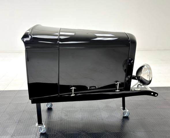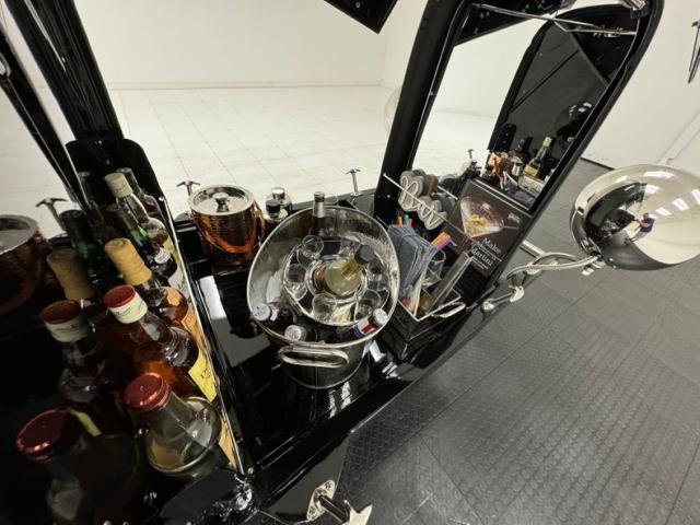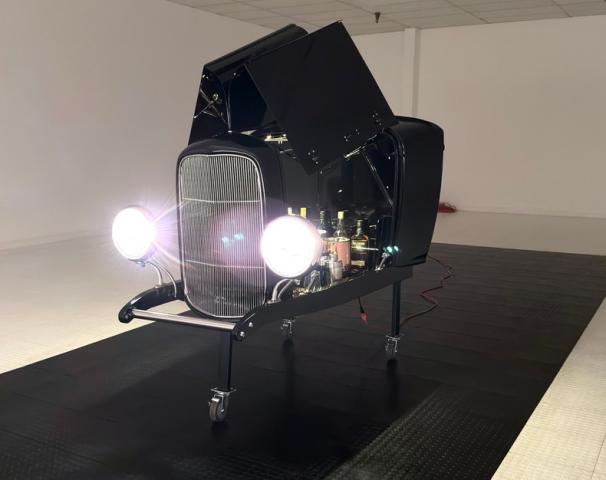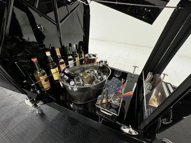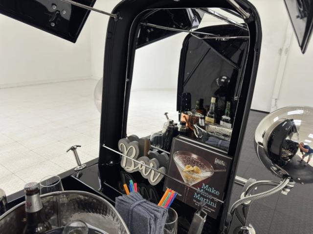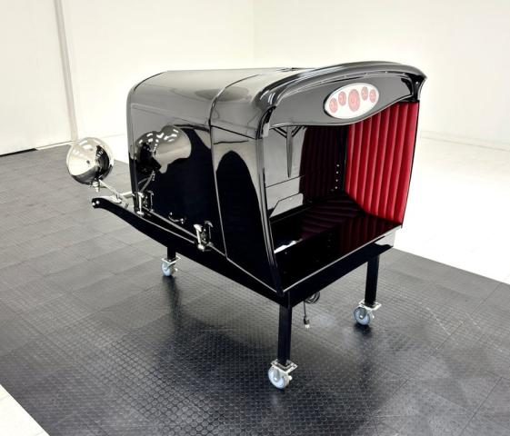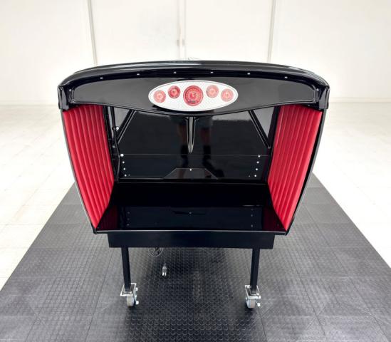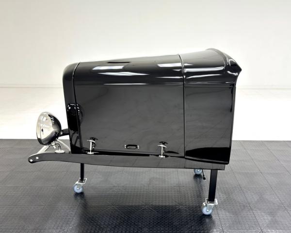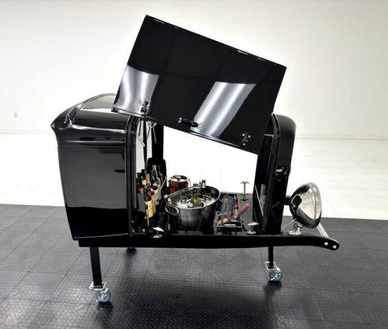 Hand rubbed black urethane paint covers the Ford in inky smoothness and its full sized grille is flanked by working headlights. In the back, the gauge cluster also illuminates the simulated red gauges. Rolled and pleated red vinyl lines what would be the kick panels. Authentic style hood latches are on each side and the engine covers reveal with shelves and a floor below the handmade frame rails to hold ice buckets, bottles, or anything else that might fit. Every bar needs a mirror and there is one on the radiator side of the interior, cut to fit. There are under hood lights so even in the darkest party venue, you\'ll be able to see what bottle you\'re reaching for.