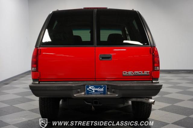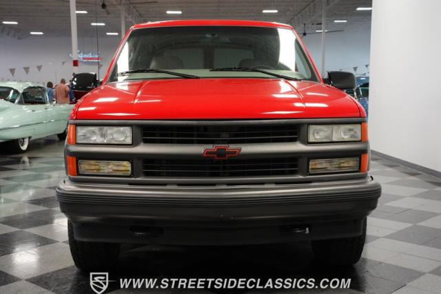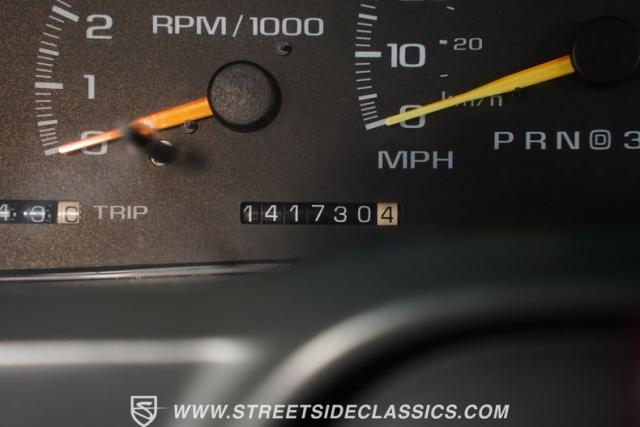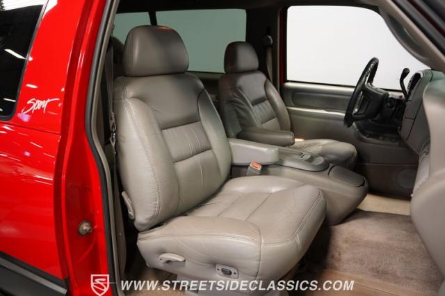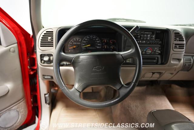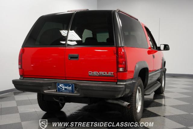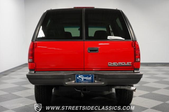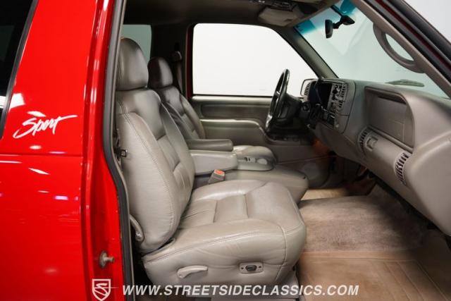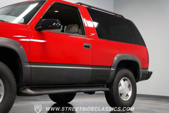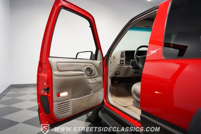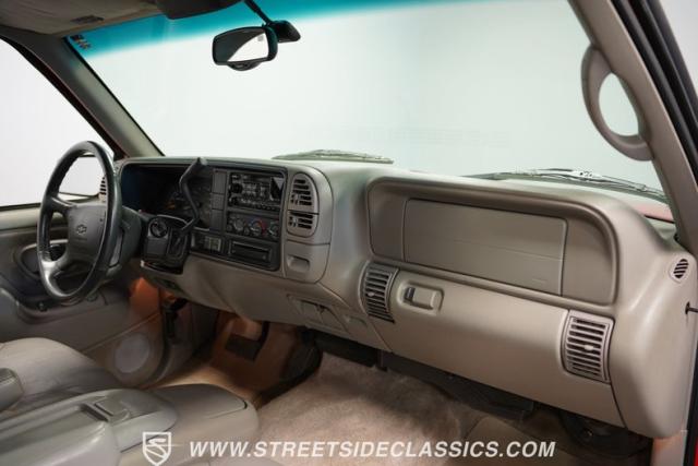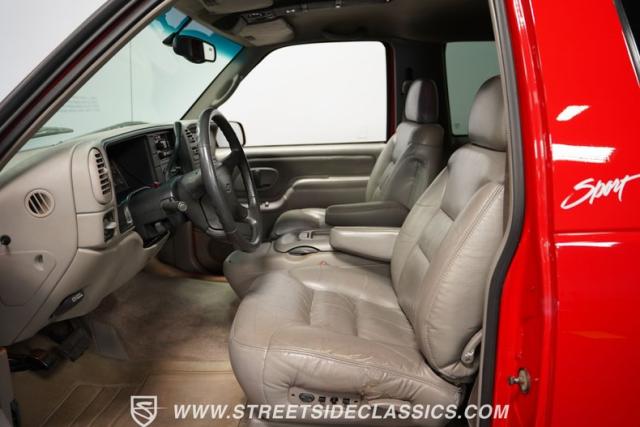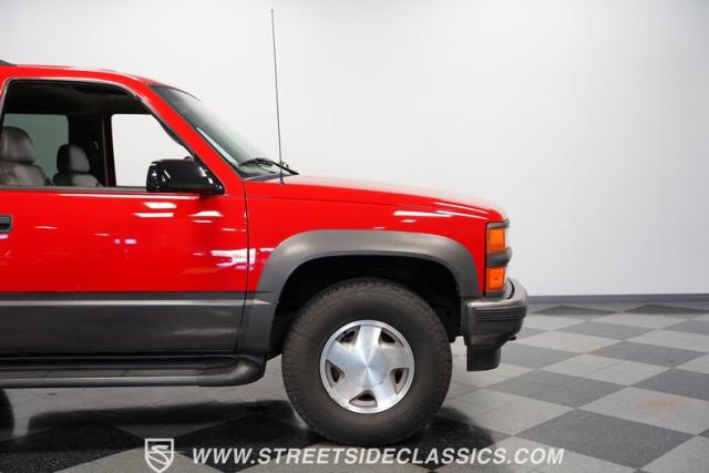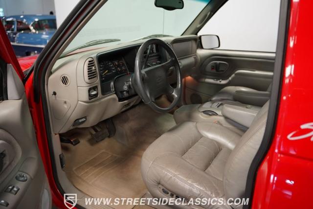 This 1997 Chevrolet Tahoe Sport 4x4 rolls in with a bold red exterior that screams adventure. The two-tone paint job, flared wheel arches, and blackout grille with a red Chevy bow tie upfront pay homage to the iconic Silverado 454 SS from the 1990s. Its muscular stance is amplified by 16-inch wheels wrapped in meaty 265/75R16 tires, ready to tackle any terrain. The running boards and tow hitch add functionality and rugged appeal, making this Tahoe a true all-rounder for work or play.