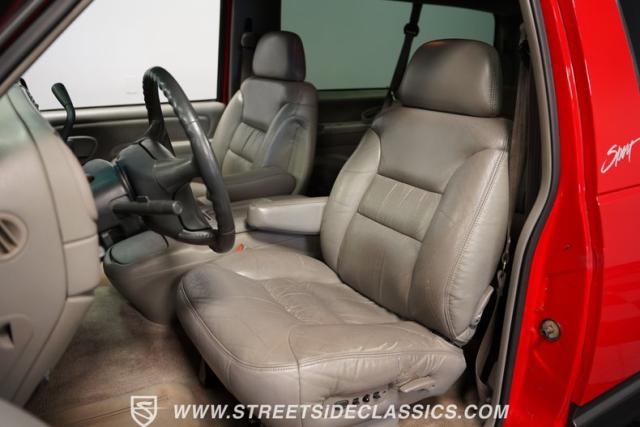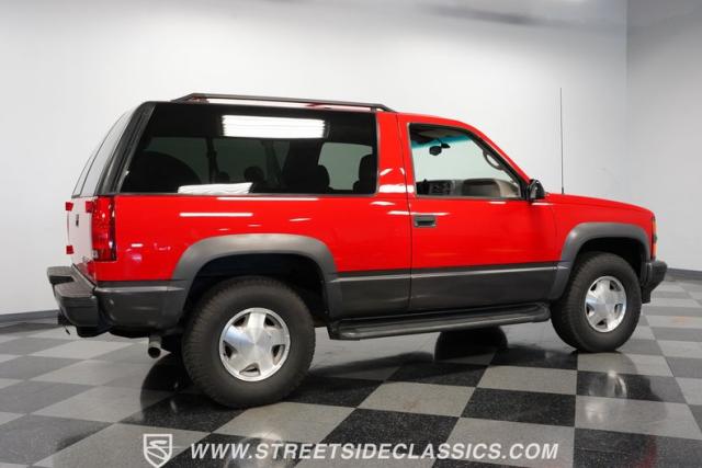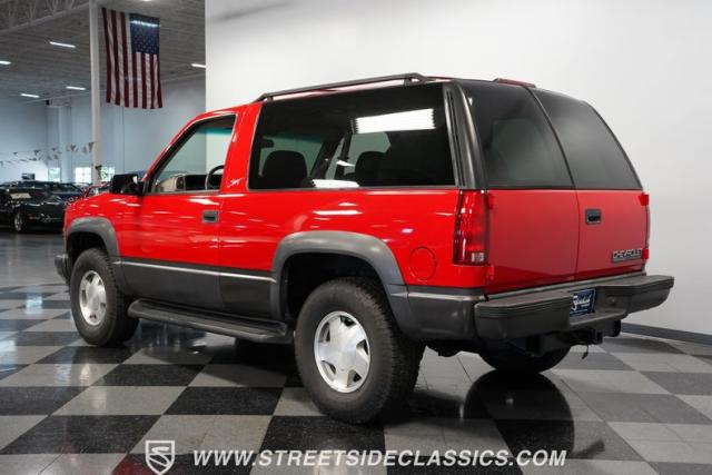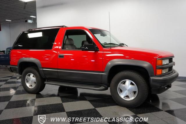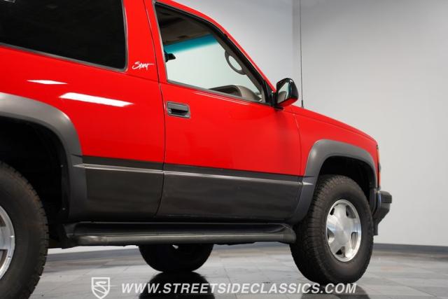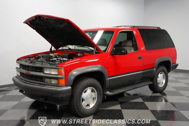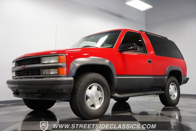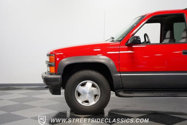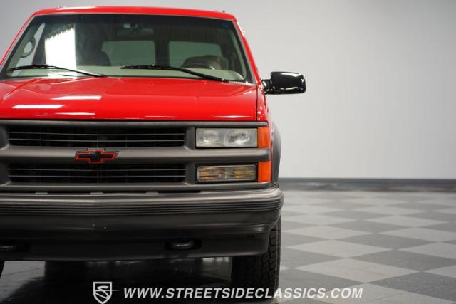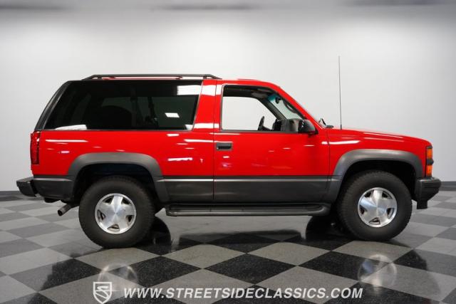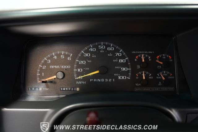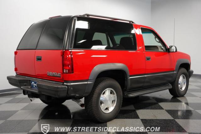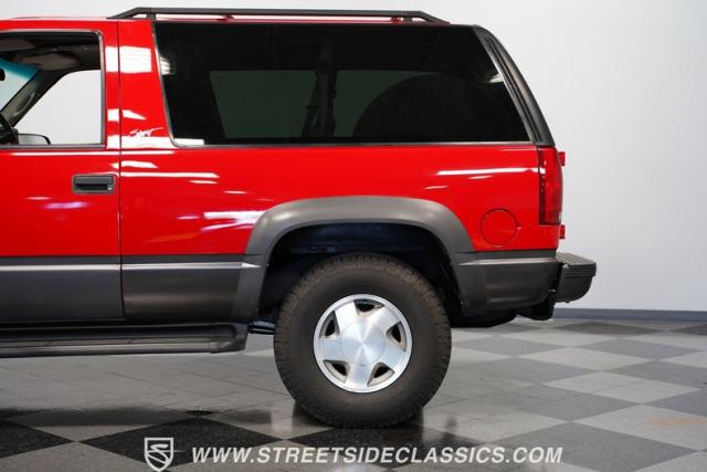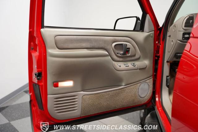 This 1997 Chevrolet Tahoe Sport 4x4 rolls in with a bold red exterior that screams adventure. The two-tone paint job, flared wheel arches, and blackout grille with a red Chevy bow tie upfront pay homage to the iconic Silverado 454 SS from the 1990s. Its muscular stance is amplified by 16-inch wheels wrapped in meaty 265/75R16 tires, ready to tackle any terrain. The running boards and tow hitch add functionality and rugged appeal, making this Tahoe a true all-rounder for work or play.
