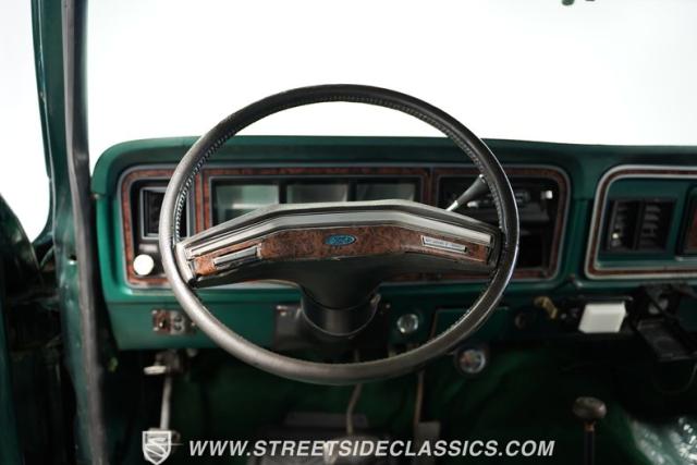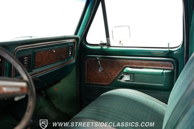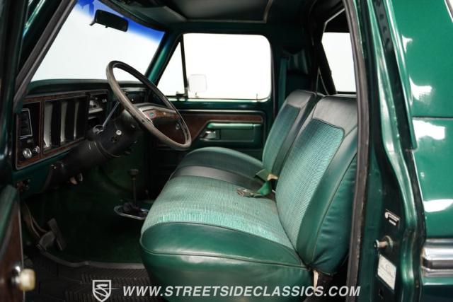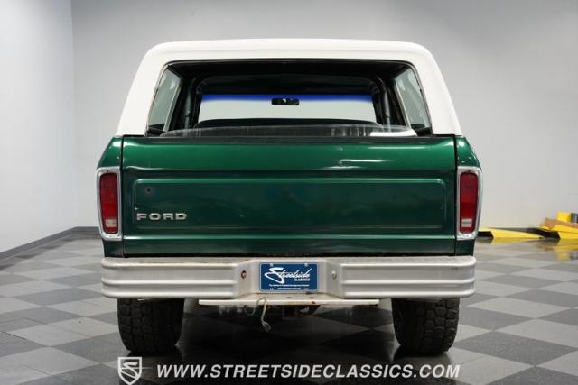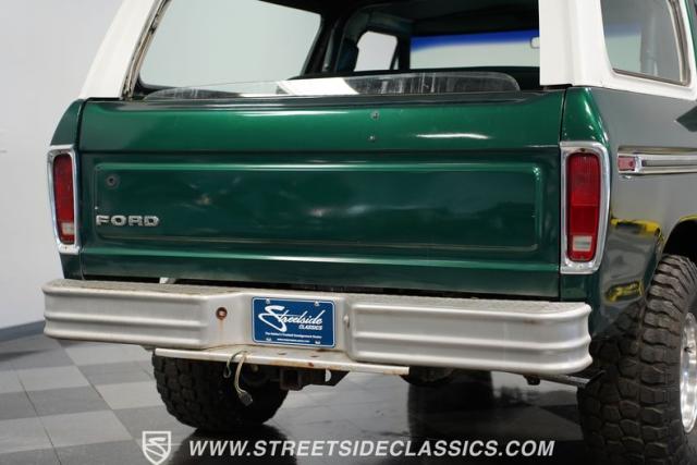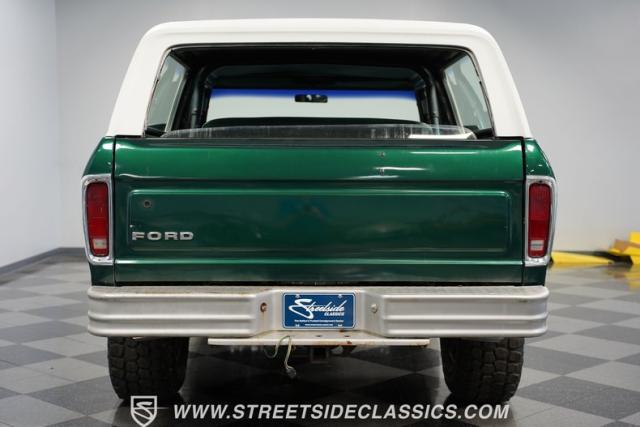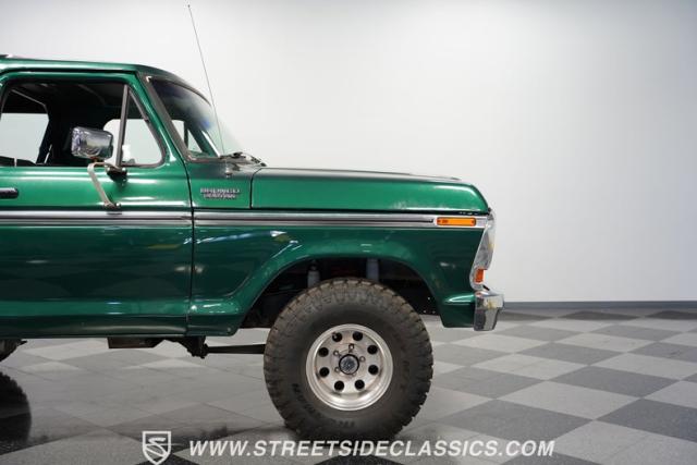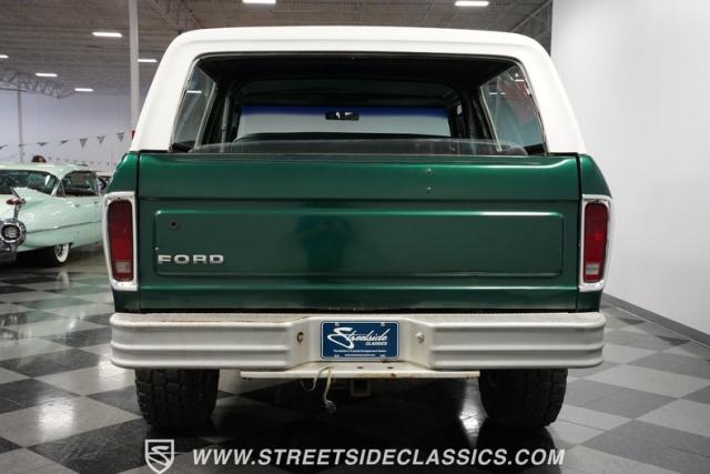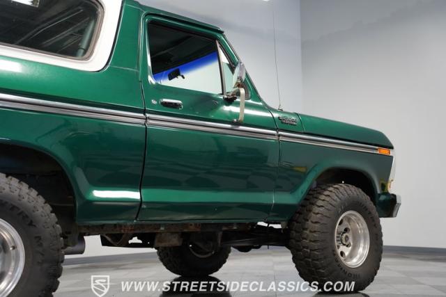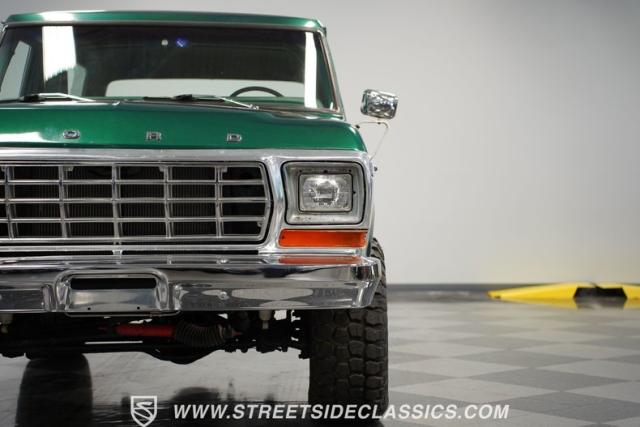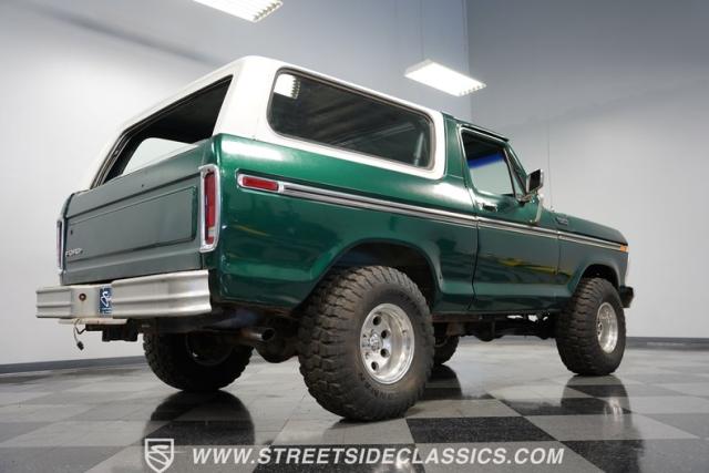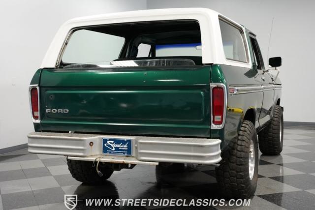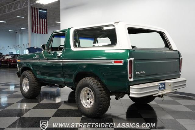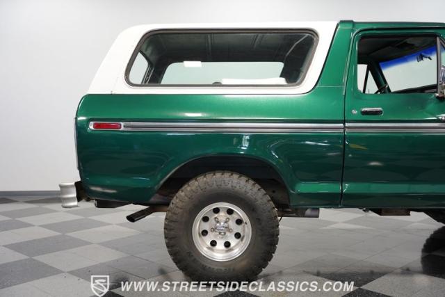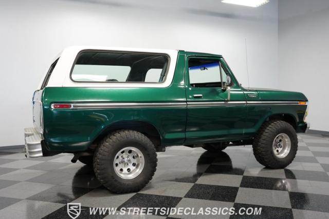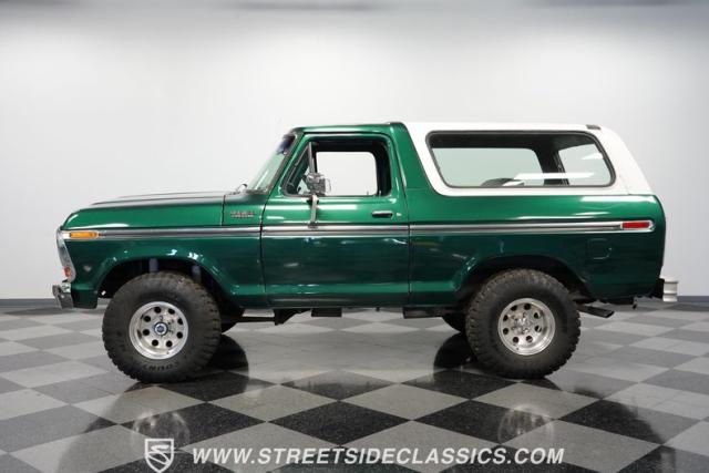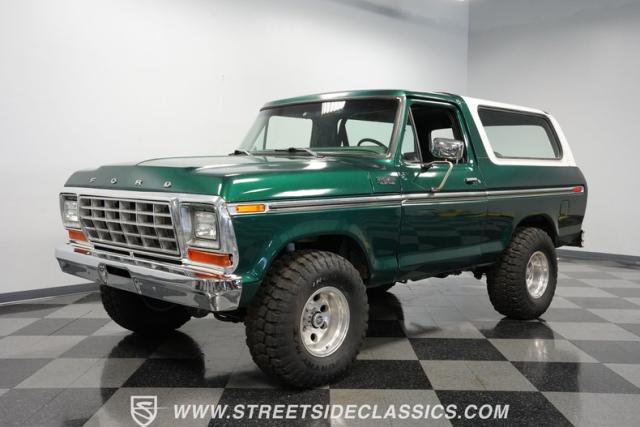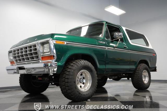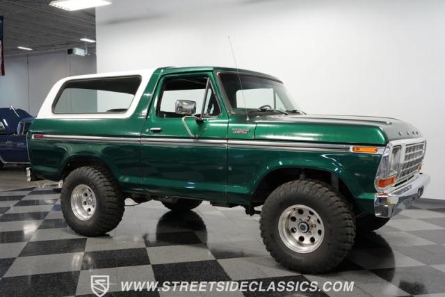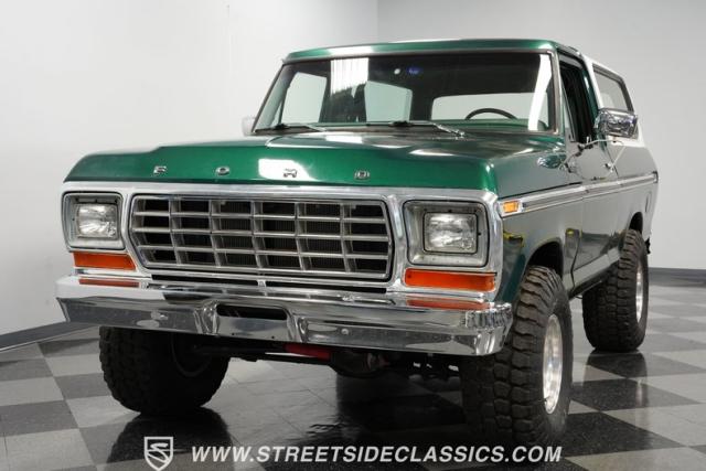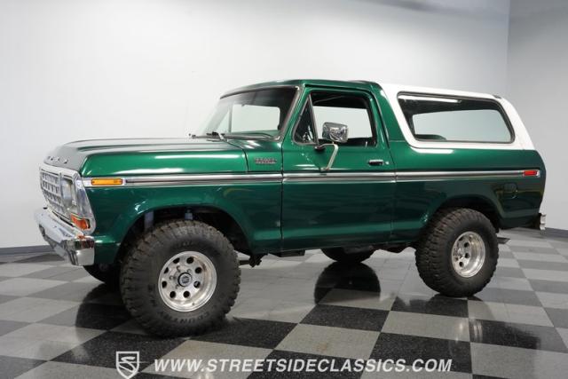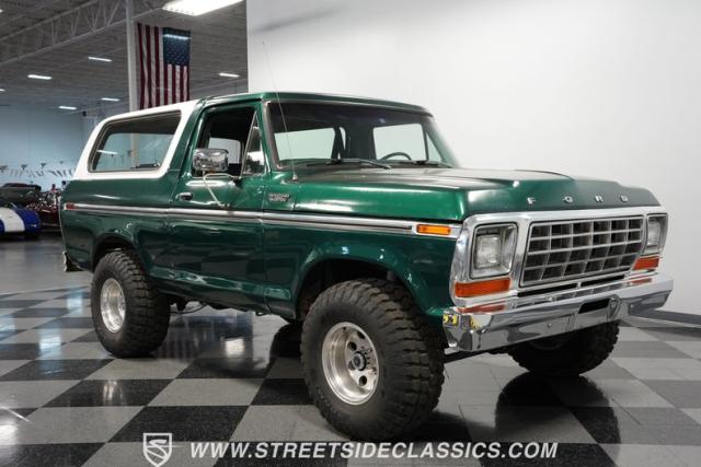 This 1979 Ford Bronco 4x4 has been a father-son project for three years, creating lasting memories. The Green Metallic paint gives this classic SUV a unique appearance both on and off-road. Its boxy shape and two-door design showcase the Bronco\'s iconic style. Riding on 15\" wheels with 33x12.50R15LT tires, this vehicle is ready for various terrains. The front grille, adorned with the Ford emblem, leads the way, while the removable hardtop offers versatile driving options.