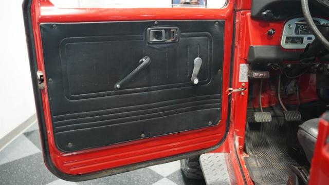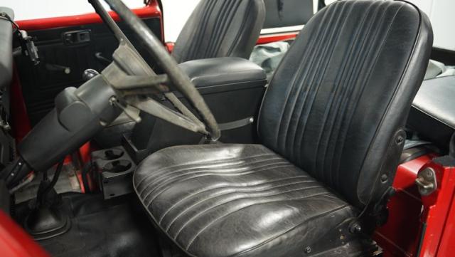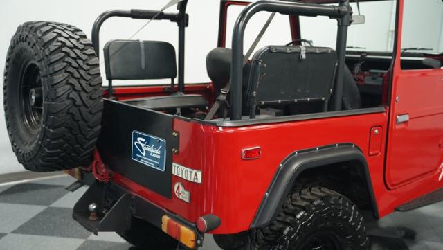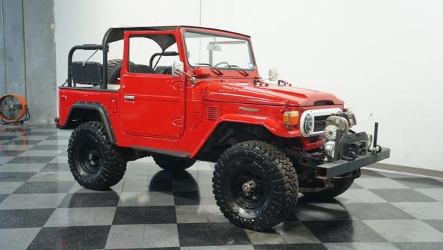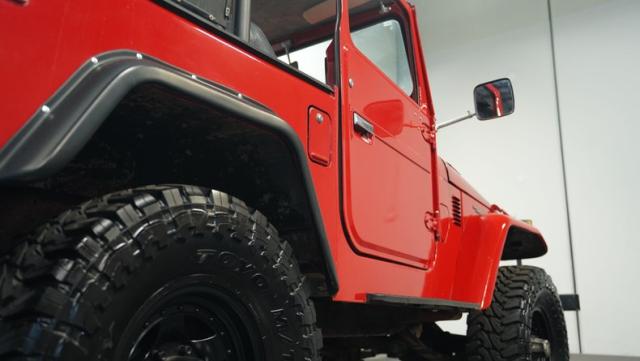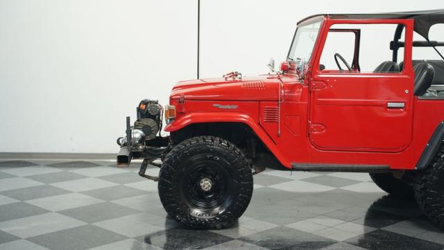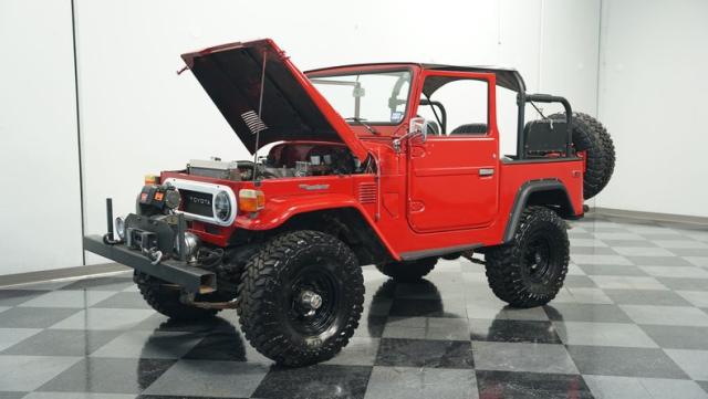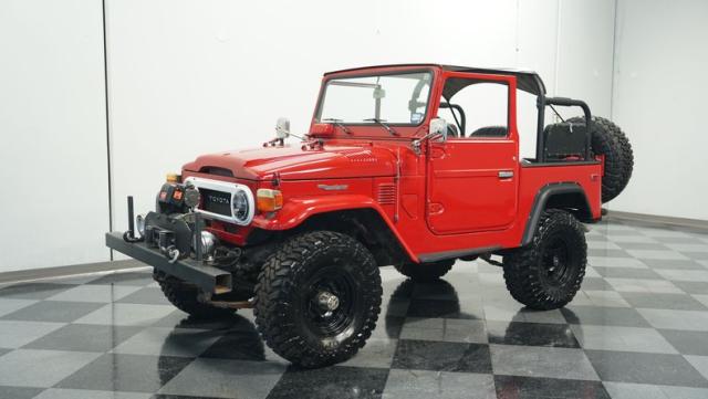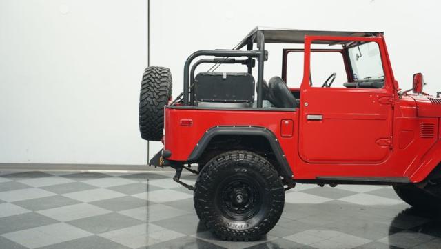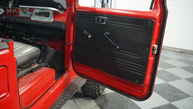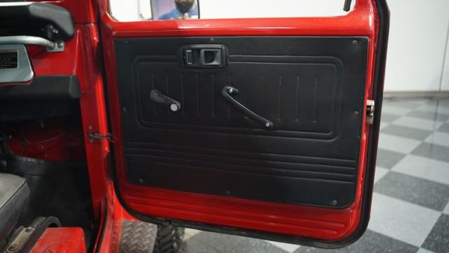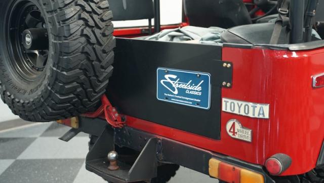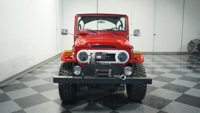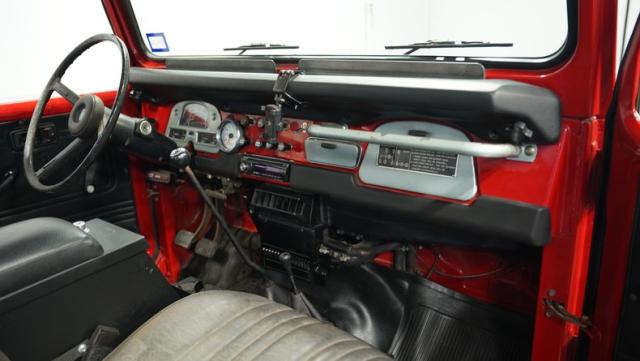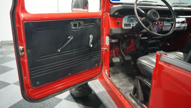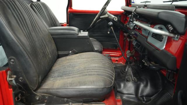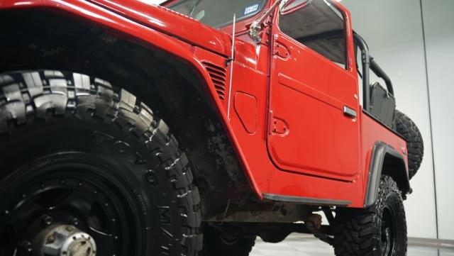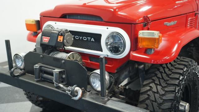 This FJ40 Land Cruiser has received over $20,000 in professional servicing over the past two years. The red paint amplifies its off-road-ready stance, elevated by aggressive Toyo Open Country 33x12.5R15LT tires mounted on 15-inch wheels. The front end features a Warn winch, ready for action. A bikini top adds versatility for open-air adventures, while the classic FJ40 body lines showcase Toyota\'s legendary design. The front bumper, lighting array, and clean windshield complete this trail-ready machine.