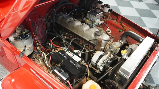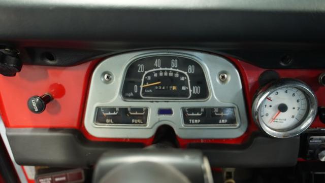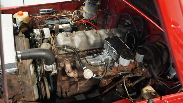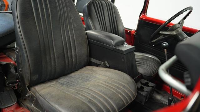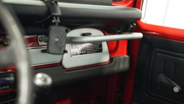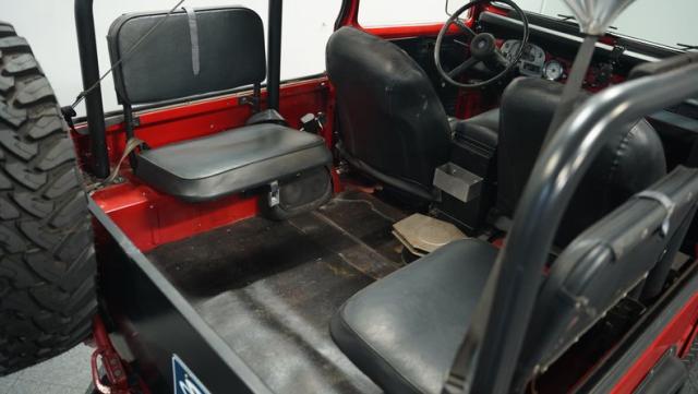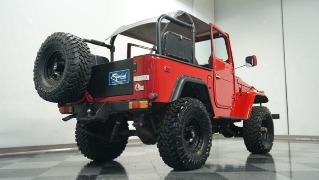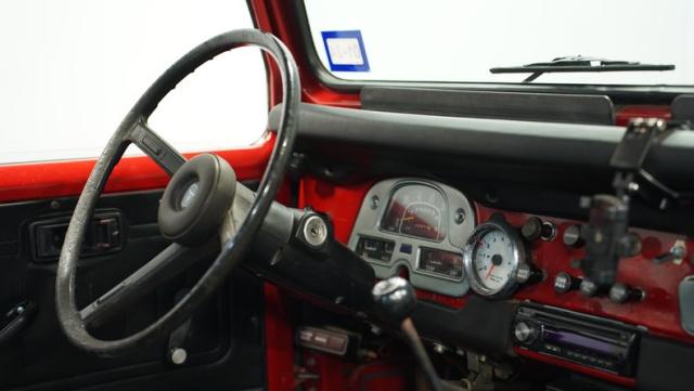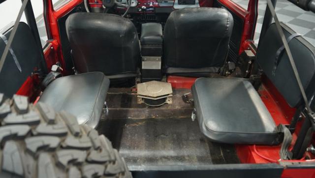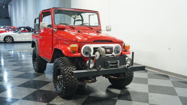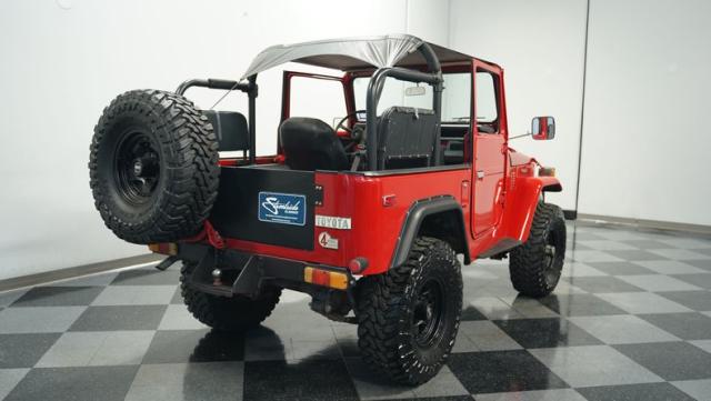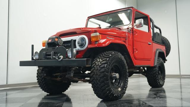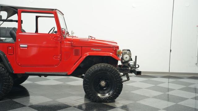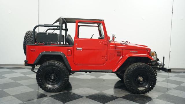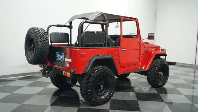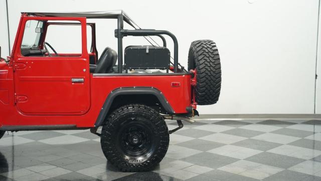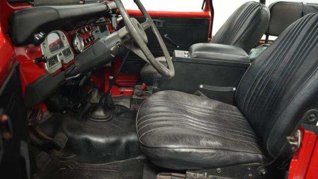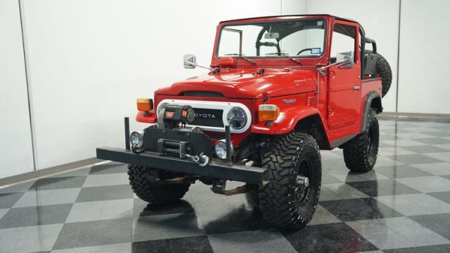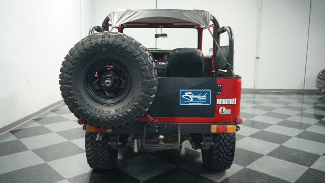 This FJ40 Land Cruiser has received over $20,000 in professional servicing over the past two years. The red paint amplifies its off-road-ready stance, elevated by aggressive Toyo Open Country 33x12.5R15LT tires mounted on 15-inch wheels. The front end features a Warn winch, ready for action. A bikini top adds versatility for open-air adventures, while the classic FJ40 body lines showcase Toyota\'s legendary design. The front bumper, lighting array, and clean windshield complete this trail-ready machine.