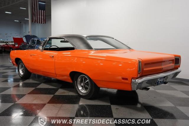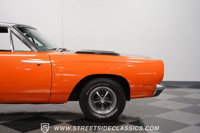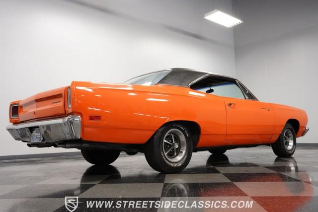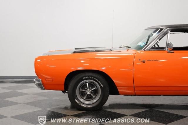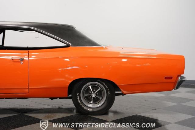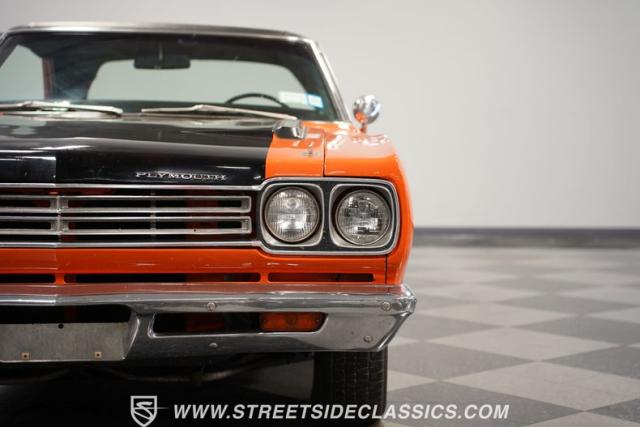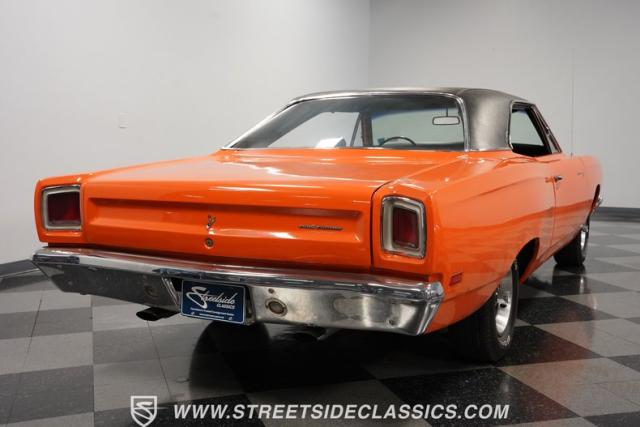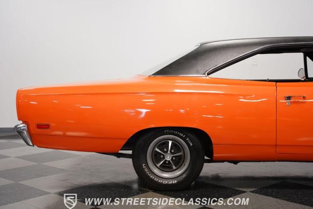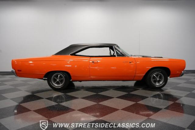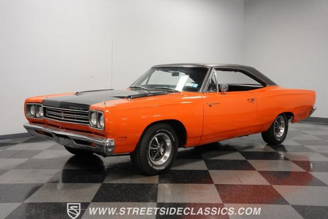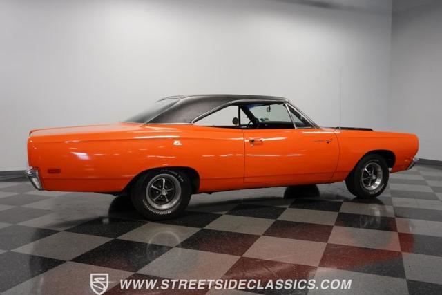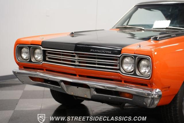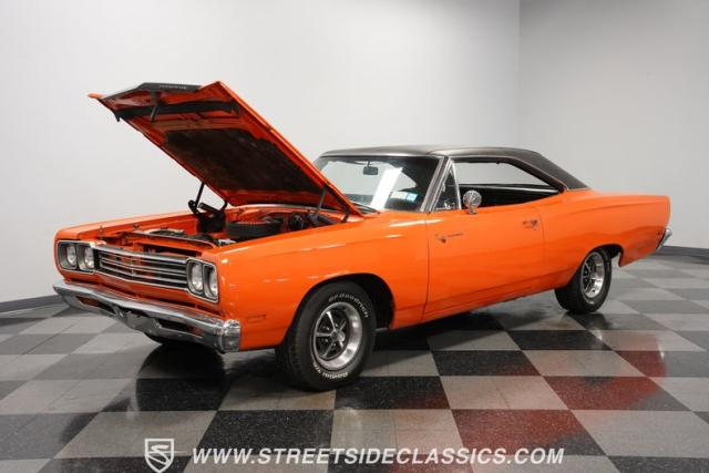 This 1969 Plymouth Road Runner is street-bred and competition-ready. Its Vitamin C orange paint screams pure adrenaline. Menacing black hood stripes announce the serious firepower underneath, while a black vinyl top adds an extra dose of muscle car attitude. Those Magnum 500 14-inch wheels and fat 225/70R14 tires put maximum rubber on the pavement. Hood-mounted turn signals and a left-hand racing mirror complete this street warrior\'s arsenal.