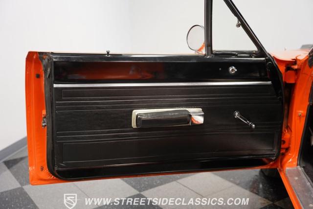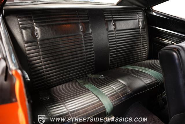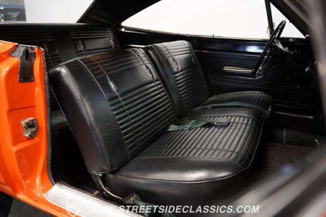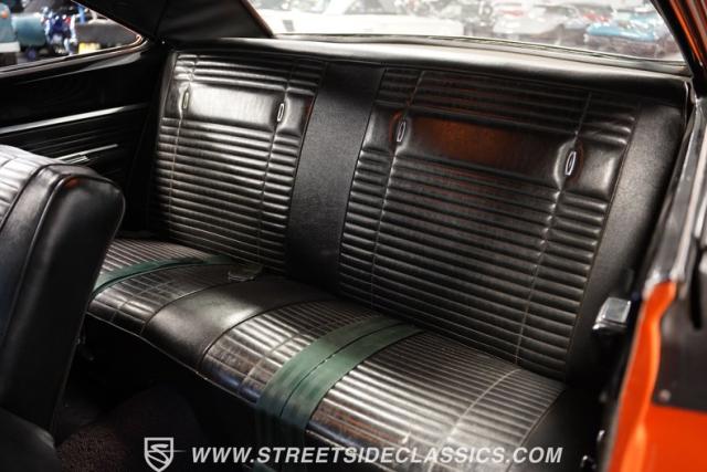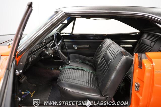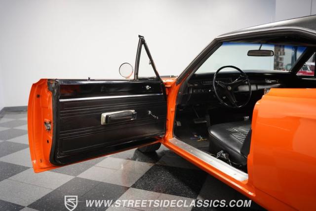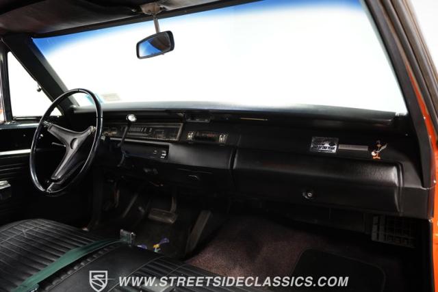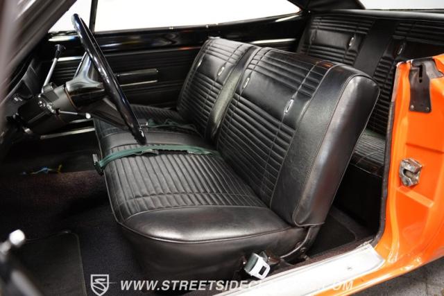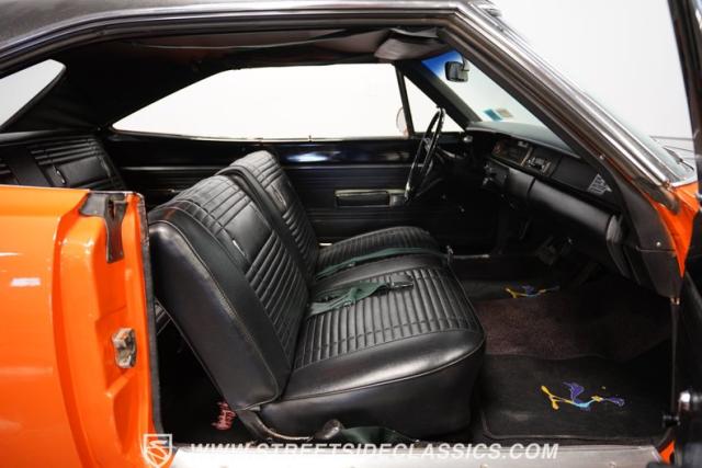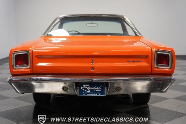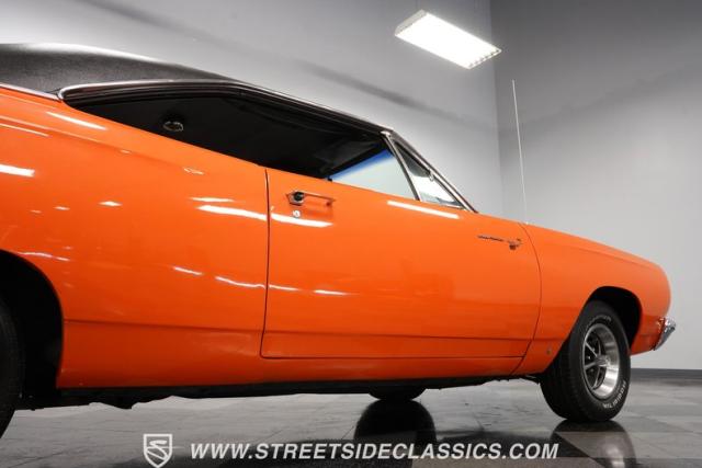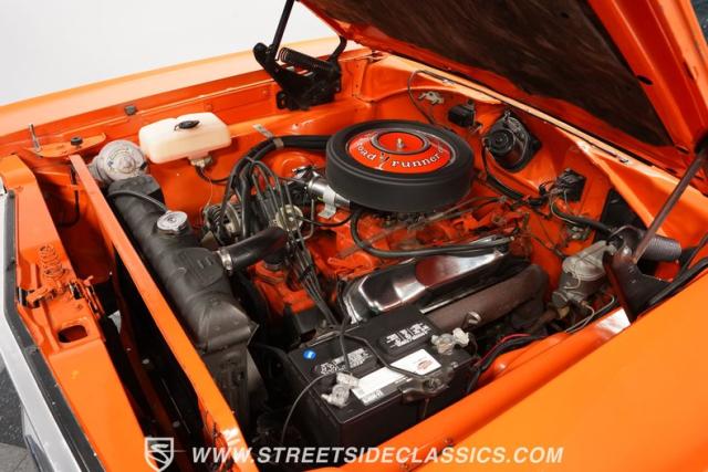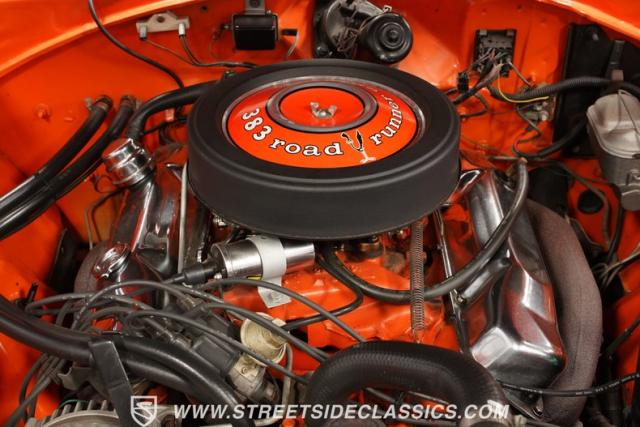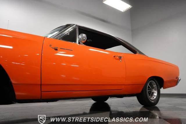 This 1969 Plymouth Road Runner is street-bred and competition-ready. Its Vitamin C orange paint screams pure adrenaline. Menacing black hood stripes announce the serious firepower underneath, while a black vinyl top adds an extra dose of muscle car attitude. Those Magnum 500 14-inch wheels and fat 225/70R14 tires put maximum rubber on the pavement. Hood-mounted turn signals and a left-hand racing mirror complete this street warrior\'s arsenal.