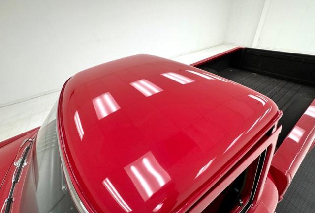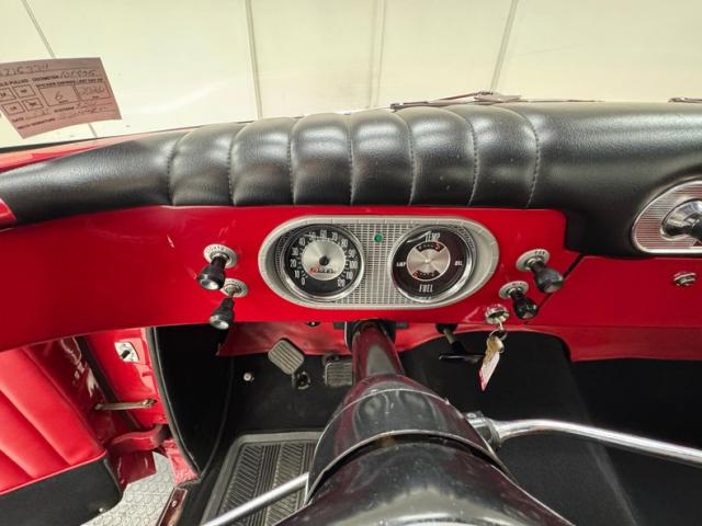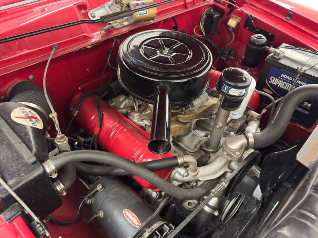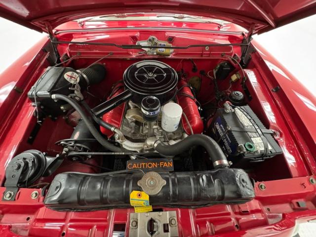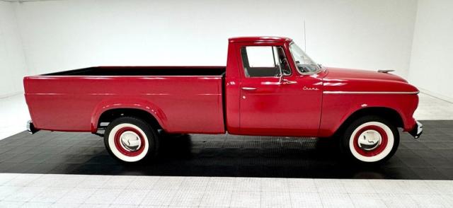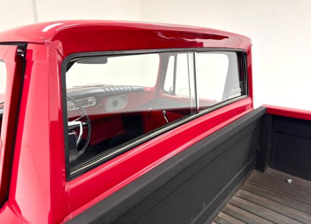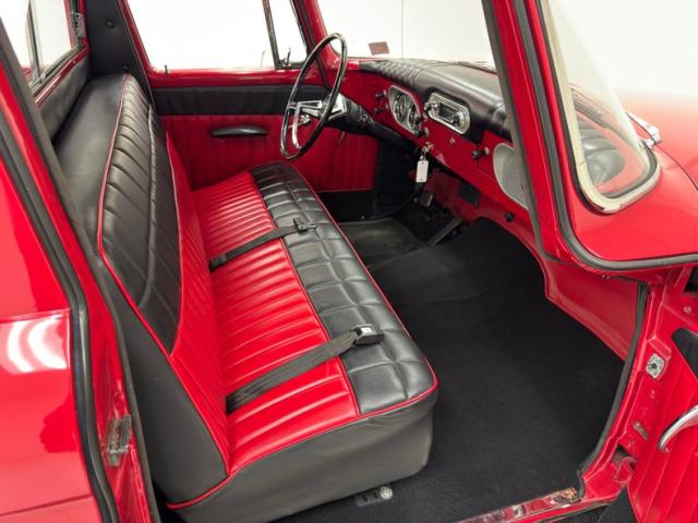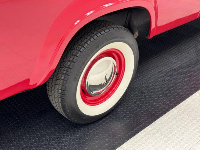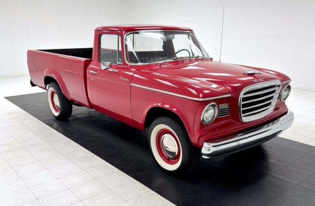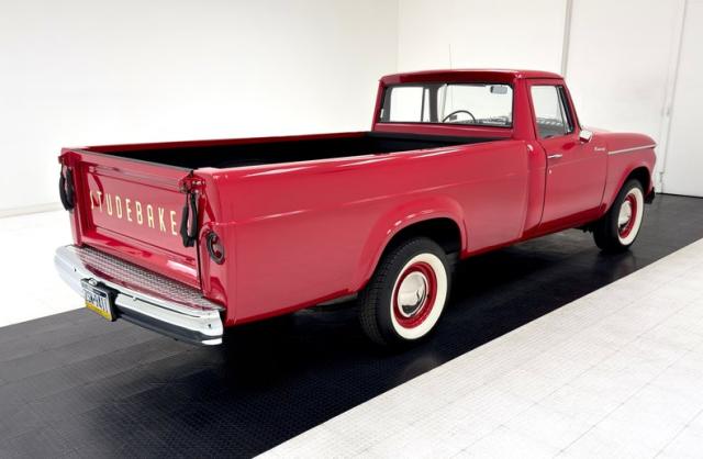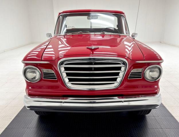 Two stage Apache Red coats this truck, a lovely color for this Lark fronted pickup truck that was intended to compete with the Ford Ranchero and Chevy El Camino at the time. As such, it has a relatively long bed which extends well past the rear axle. The trapezoidal grille is flanked by side markers that mirror the horizontal bars of the grille on a smaller scale and contour to the lines of the grille on one side and the round headlights on the other. The hood also contours, this time to the shape of the grille, with a slight rise in the middle capped off by a hood ornament that depicts a jet, and you don\'t want to be on the wrong side of it on the street. Proper Studebaker wheel covers are on the 15-inch red wheels wrapped in white wall tires. The paint and metal work are near excellent on the truck and imperfections are limited to a scratch a the tail light panel near the rear bumper.