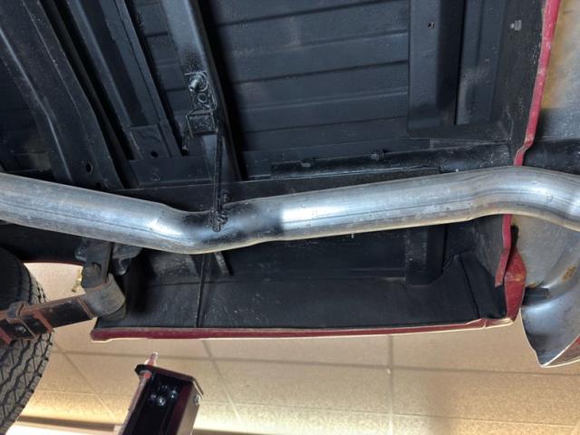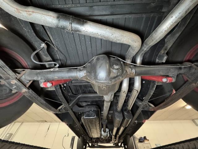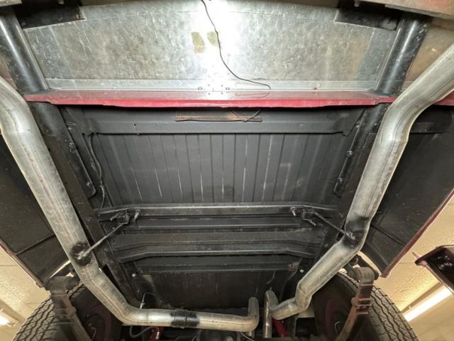 Super clean underneath with minimal surface rust and no leaks. The dual exhaust comes from the engine and meets a pair of FlowMaster mufflers before finding their way to terminating in the back. Leaf spring suspension is used front and back and drum brakes are also found at both ends.