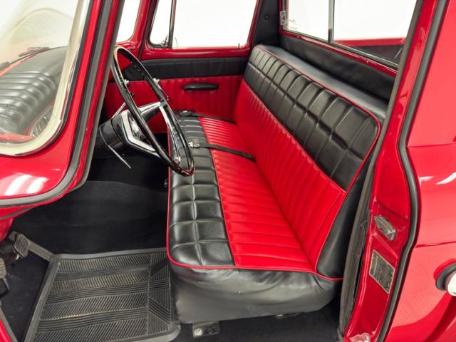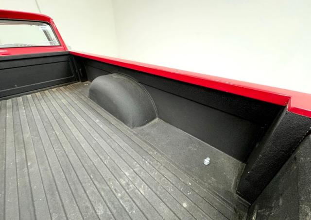 With a conservatively styled exterior, we gain some flash on the inside as geometric patterns of red and black vinyl along with an aluminum panel that make up the door panels. The bench seat presents with red stitched inserts surrounded by black vinyl and is in great shape, with only minor compression shown. The standard steering shows some story telling patina, while the stitched black dash pad appears fresh and under it, a body colored metal dash housing a small meshed gauge pod and several knobs, all a working truck would need in 1961. An AM radio lives in the middle of the dash just above a glove box and ahead of the passenger, a round mesh feature on the dash is home to a speaker. The floor is covered with a low pile back carpet, the headliner with a perforated piece, and a large rear window affords great over the shoulder visibility and views of the black painted bed.