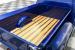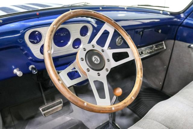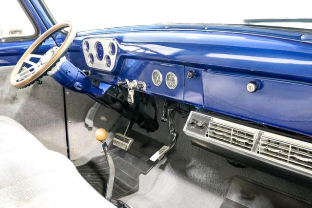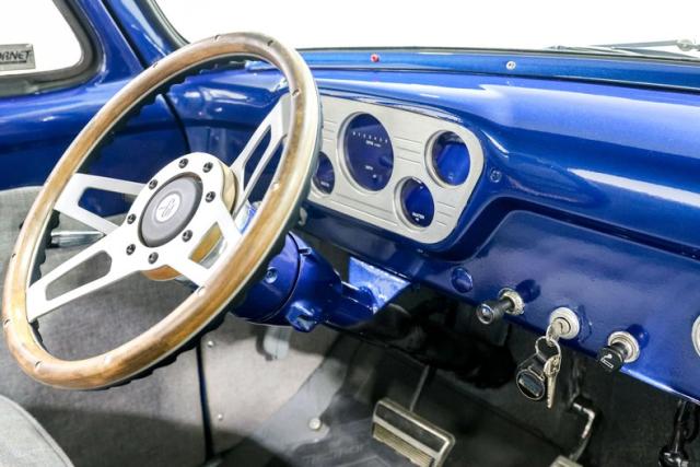 Visually, the blue finish highlights the F100\'s timeless body lines while details like the reverse tilt hood and aggressive louvered hood add just the right amount of hot rod attitude. Out back, an oak wood bed with stainless strips gives the truck a show-quality finish that perfectly balances classic style with custom craftsmanship. New glass and fresh weatherstripping help keep everything tight and clean.