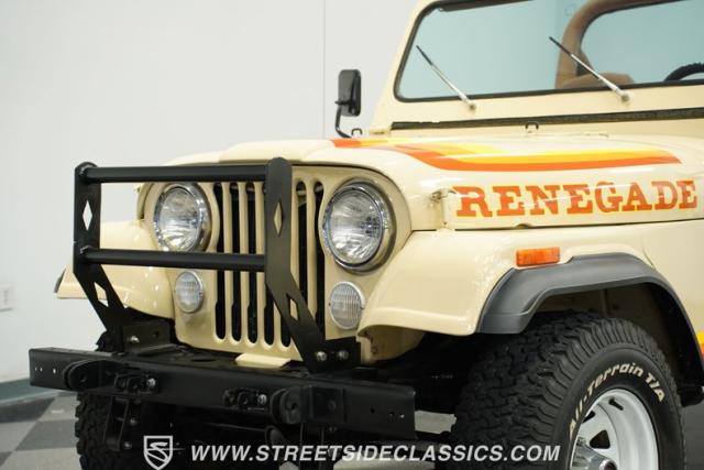 This 1981 Jeep CJ7 4X4 Renegade keeps its authentic feel thanks to leaf springs at the front and rear, highlighted by new shocks, bushings, steering box and rod. Deep fifteen-inch white rims are covered by 31-inch BFGoodrich all-terrain tires, with a fifth full-sized spare mounted just above the rear tow-hitch. If you want to participate in the famous Jeep Wave and also enjoy driving one of the most respected trucks ever made, then don\'t wait another second; this CJ7 is the one you\'ve been waiting for. Call today!