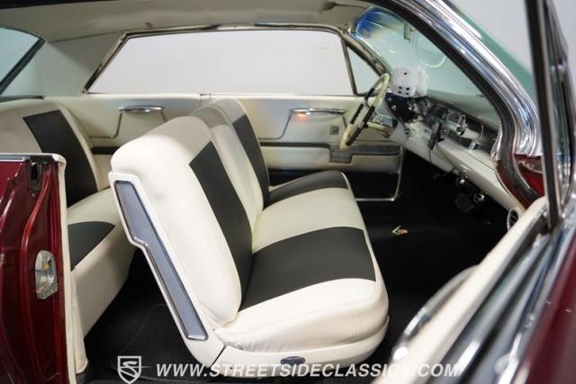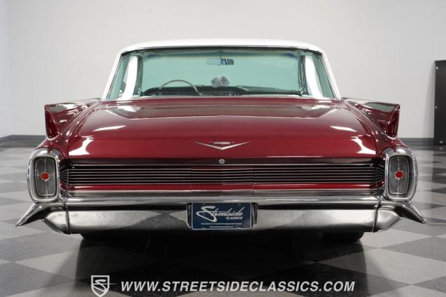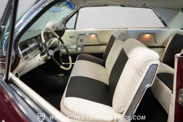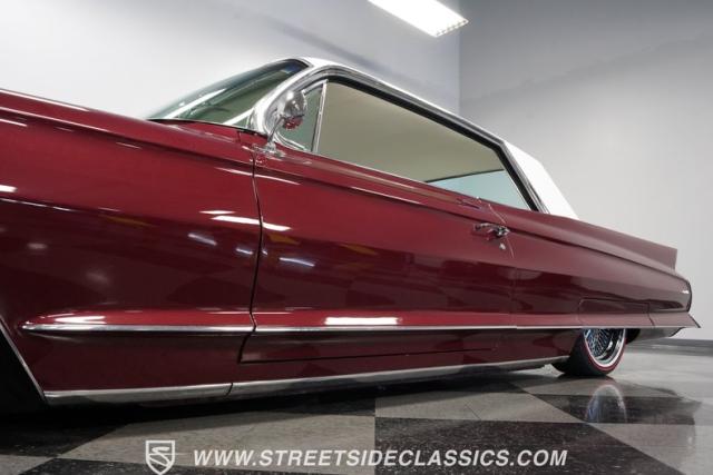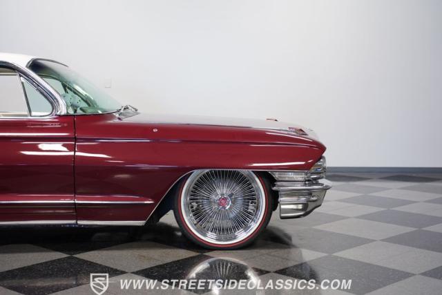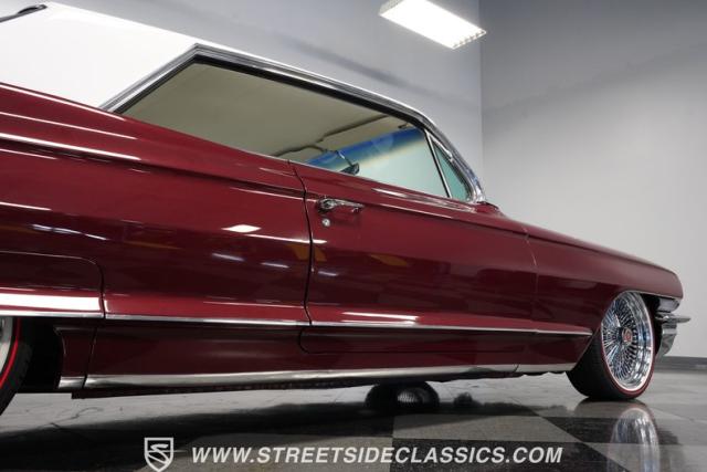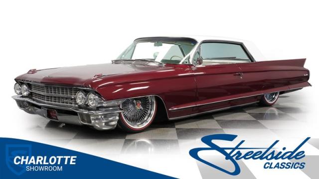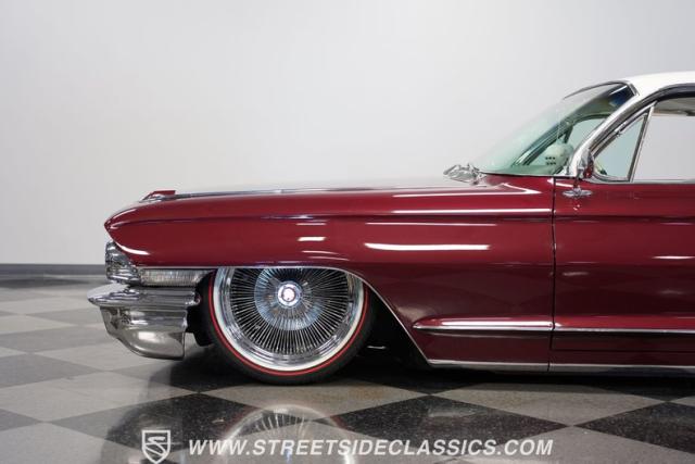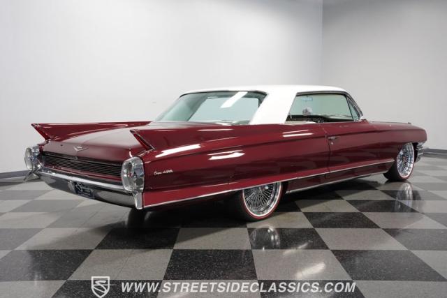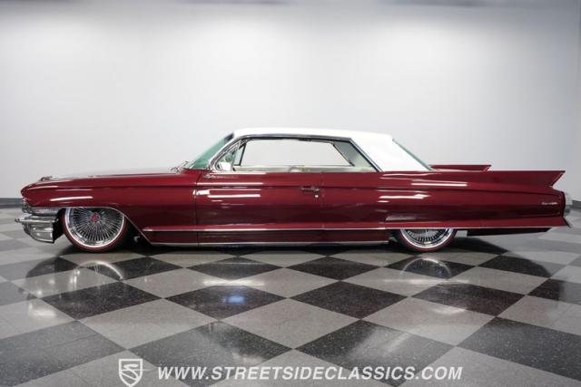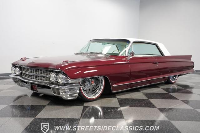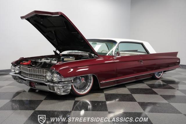 This 1962 Cadillac Coupe DeVille showcases a striking Burgundy Metallic finish that exudes classic American luxury. A contrasting white roof accentuates The sleek two-door profile, creating a bold two-tone effect that captures the essence of early \'60s style. Chrome elements, including the massive front grille, bumpers, and trim, add a touch of brilliance to the exterior. The car\'s stance is significantly enhanced by its air-ride suspension, allowing for adjustable height and an aggressive look when lowered. Rolling on 20-inch Luxor 100-spoke wheels wrapped in 245/40R20 Vogue tires, this Cadillac combines vintage charm with modern flair. LED headlights with white halos provide improved visibility and a contemporary touch to the iconic front end.