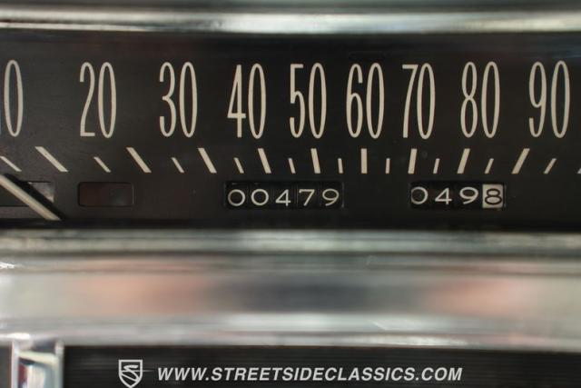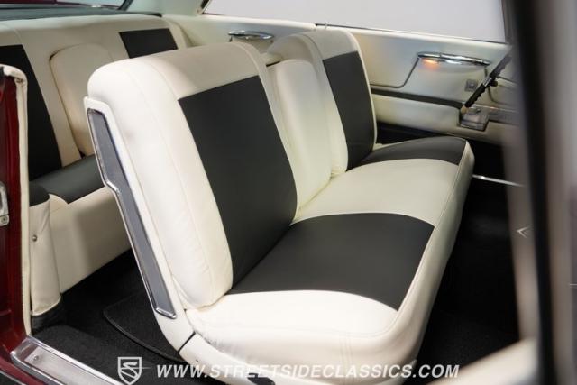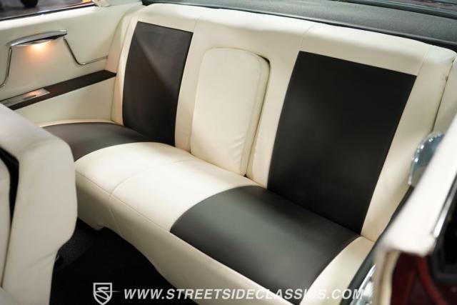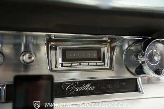 Inside, the cabin is a study in opulent comfort, recently restored with an estimated investment of $10,000. White vinyl upholstery covers the split-bench seats, door panels, and rear interior surfaces, punctuated by black accents that create a sophisticated contrast. The dash, wrapped in vinyl, houses the original-style gauge cluster and controls. Power windows, door locks, and a remote trunk release make the luxury experience convenient. A modern touch comes in a retro-style AM/FM stereo with Bluetooth connectivity, seamlessly blending period-correct aesthetics with current technology. The spacious interior exemplifies the roominess and comfort that made Cadillac the standard of the world.