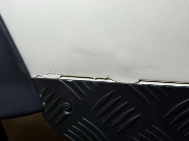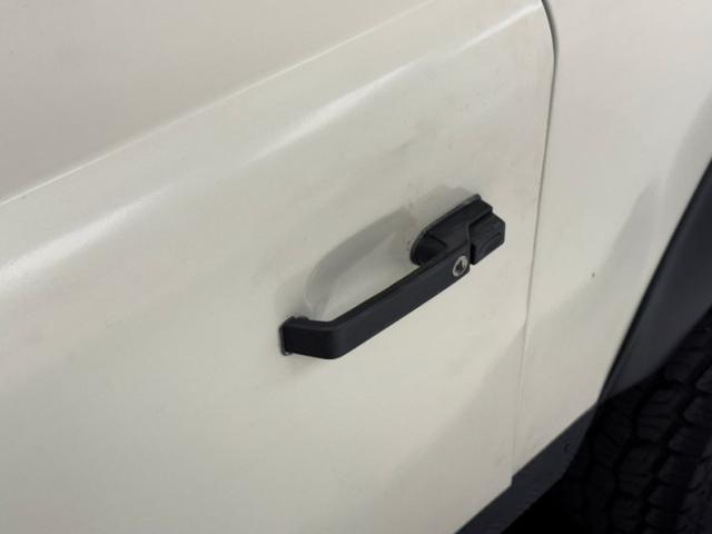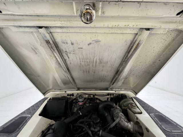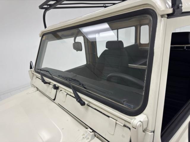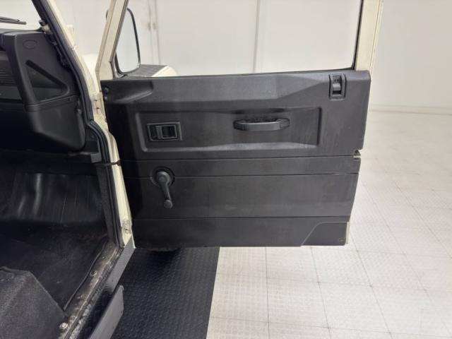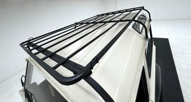 A face so handsome it\'s recently been referenced by another automaker, here in its original form with round headlights flanked by a pair of marker lights, backed by a black bezel that blends seamlessly with the black horizontal grille. Flat fender tops equipped with texturized plates give way to a rising hood that widens as it reaches the nearly vertical windscreen. The entire truck is Chamonix White, including the roof, with its epic sky windows and in this case, a safari ready roof rack. Out back, not only diminutive tail lights and markers, but lots of windows including a large one on the side hinged door. Black fender flares hover over 16-inch wheels with 265/70R16\'s all terrain tires with a mid 2023 date code. This two door rig is gloriously square and while there\'s some evidence of body work near the black rocker trim, the rest of the truck lacks glaring imperfections.