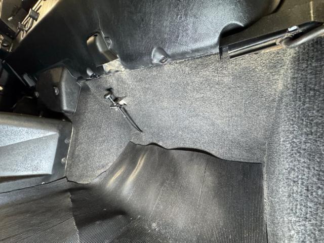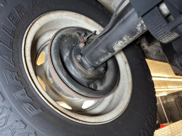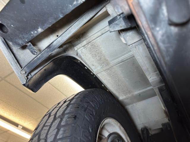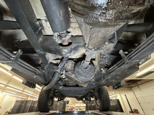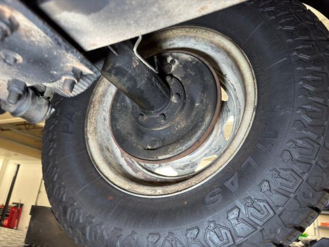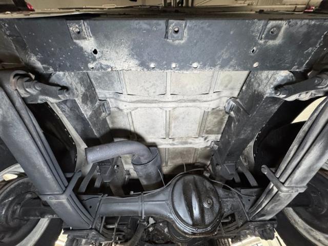 There\'s no rust present, but there are copious amounts of grease build up, oil, and dirt on the pans, differential, driveshaft, and other components. Nothing seems out of place nor broken, just dirty. The ball and claw axles are here with one a bit wetter than the rest. A single exhaust flows underneath, occasionally under some protective guards, runs through a stock style muffler then terminates under the back. Leaf spring suspension is employed front and back.
