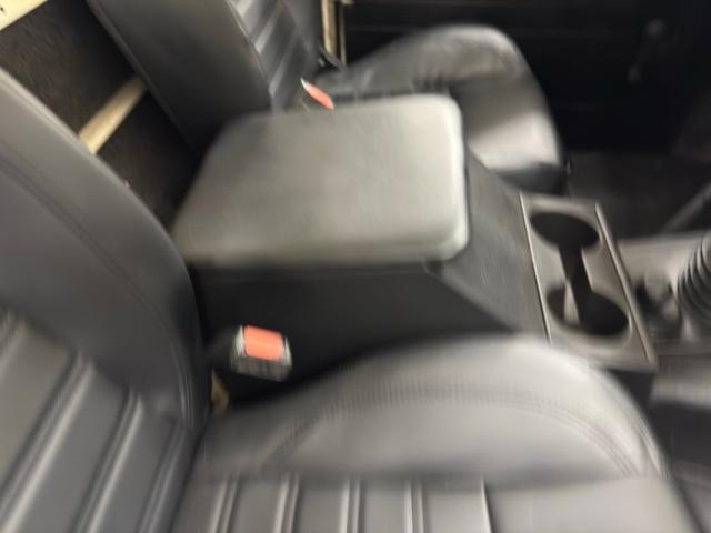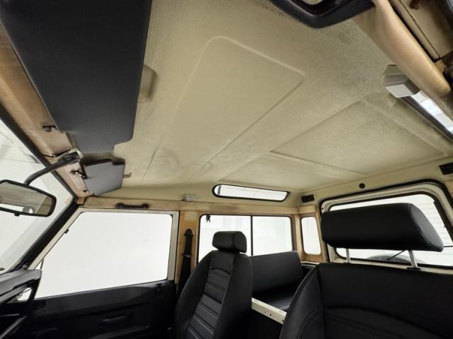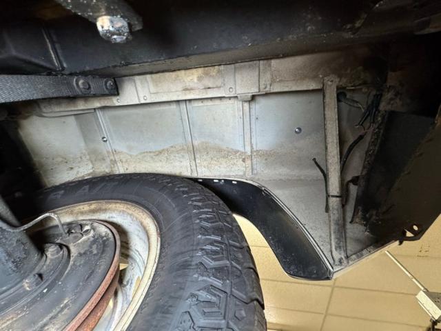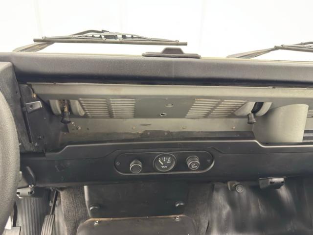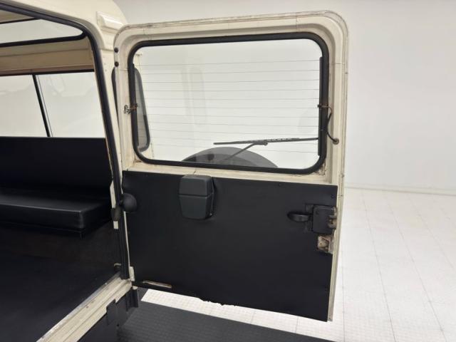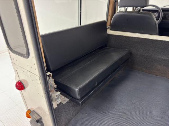 Simple black plastic door panels look like they would be very comfortable with some mud, and that goes for the rear door as well. Inside, new front bucket seats in black leather sit atop the boxed risers and present cleanly with tuck and roll inserts. In back, it\'s a playground for kids and kids at heart with center facing bench seats that are also new. A textured black steering wheel leads to a simple instrument cluster where just four gauges live beside a large panel of indicator lights. There\'s a touch of patina on the dash including the center where an oil pressure gauge is located, and we note a crack in the plastic pad on the left top corner. A utilitarian shifter rises from the center console with a rubber boot in a hard plastic case. Some under dash trim is peeling and as you would imagine, the floor is rubberized front and back over gray carpet, to trap sand, mud, and snow.