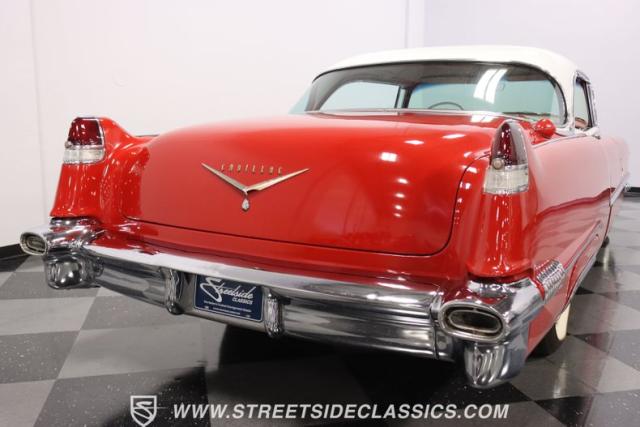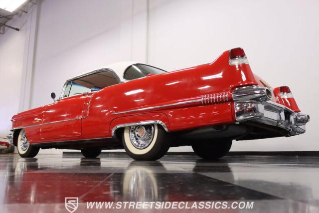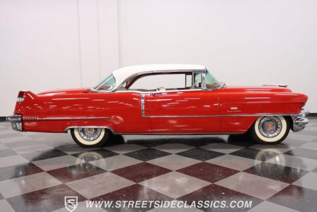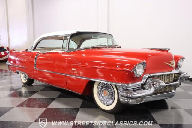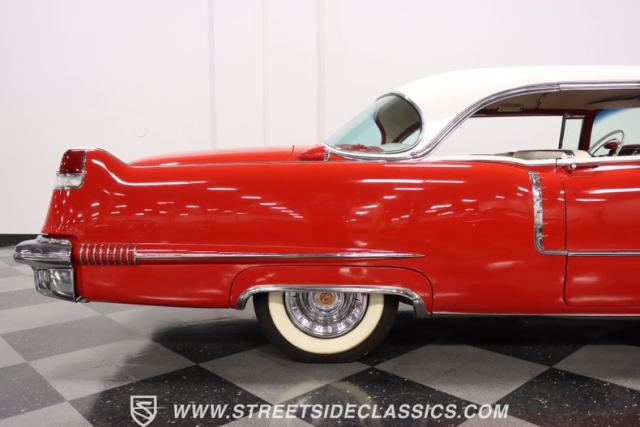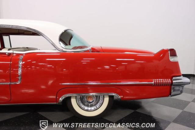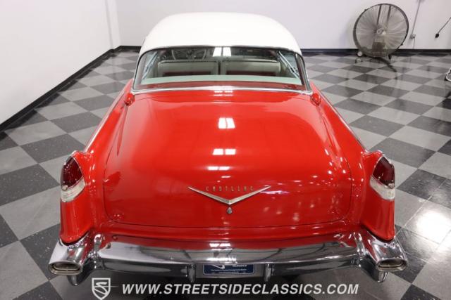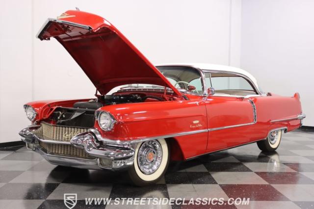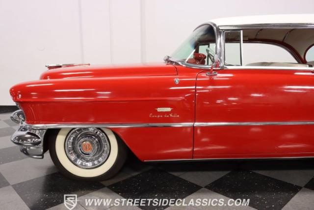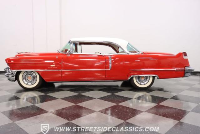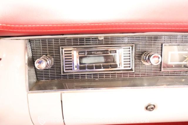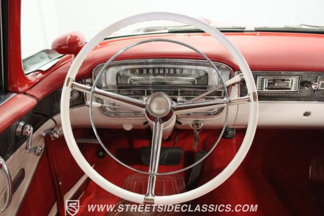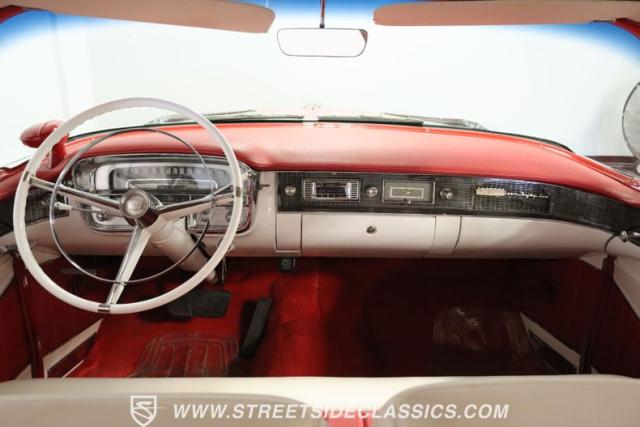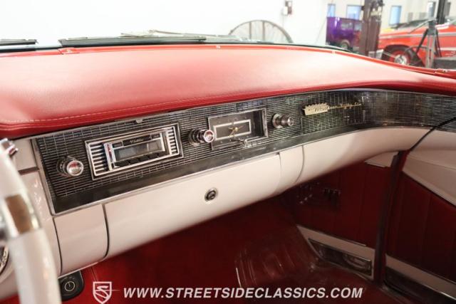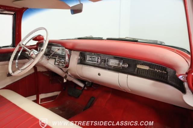 If you\'re wondering why a car like this can look so good, it\'s because it\'s coming off nearly a quarter-century under the same care. It was even fully repainted around half-way to upgrade this to a vibrant red with a pristine white roof. And a car like this 1956 Cadillac Series 62 Coupe DeVille has all the best expensive details, like the whitewall tires, fender skirts, the gas cap hidden in the flip-up tail light, and the dual exhaust routed through the rear bumper. So the exterior looks like pure rolling opulence that has been treated with the highest respect.
