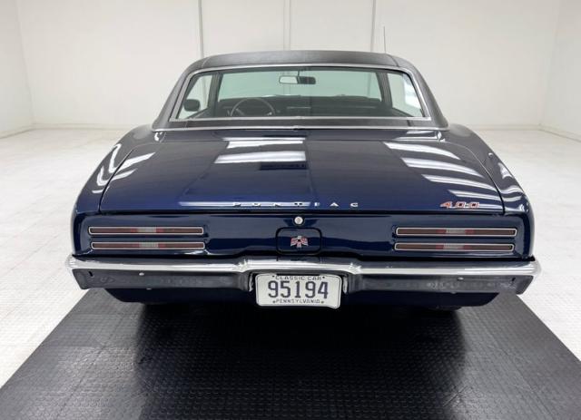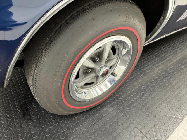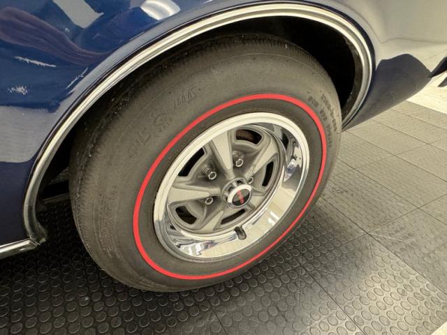 A chrome nose caps a body dressed in Aegean Blue with field marks that distinguish this car from other F-bodies of the time including ornamental trim marks that sandwich the midline on the rear quarter while Pontiac\'s arrowhead marker light appears just above the chrome end of the wrap-around bumper. In front, the early Firebird insignia, a design of Native American motif adorns the fender and reappears on the gas cap on back in a body colored fascia that houses dual slit tail lights on each side. As part of the H.O. package, dual hood scoops are up front while 14-inch Pontiac Rally II wheels carry redline tires for a well coordinated, period look. Overall the paint, black vinyl top, and brightwork are in nice condition. But no car is perfect of course, and we note gap issues on the hood with a chip on the seam, bubbling along the roof trim, touched up chips, scuffs, a door ding, and cracking paint on the rear apron.
