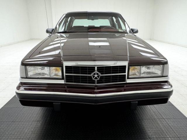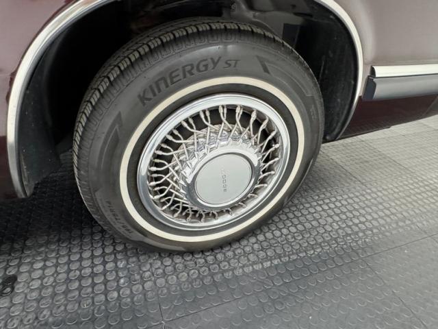 Two stage Black Cherry covers this little luxury car in gleaming fashion while the K-car roots are evident in the chrome grille with the Dodge pentastar and composite headlights for a more modern look in 1993, and a slight rise to the hood that is vaguely Lincoln-esque. The use of body colored bumper covers with trim was also the trend, moving swiftly afar from chrome. Dodge stuck with the square profile here and right angles abound with the side being enhanced by a double pinstripe and wheel opening trim that intersects with side molding. The long horizontal tail lights meet at a red reflective center plate that creates a handsome lightbar under a flat deck lid and completely vertical rear window. 14-inch wheels wear wire wheel covers and 195/75R14 tires with an early 2024 date code. The only imperfections are one area of bubbling under the paint and a few runs in the clear coat on the rockers. Our consignor states a five year ceramic coating has recently been applied.