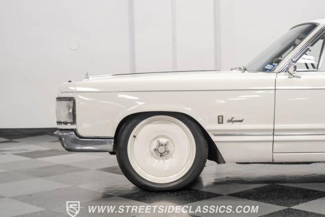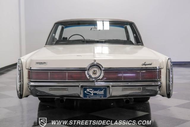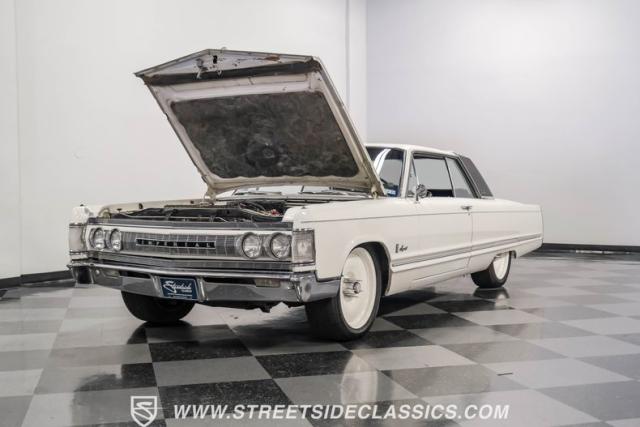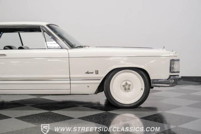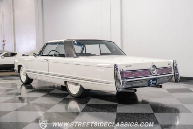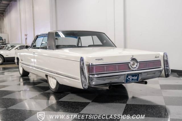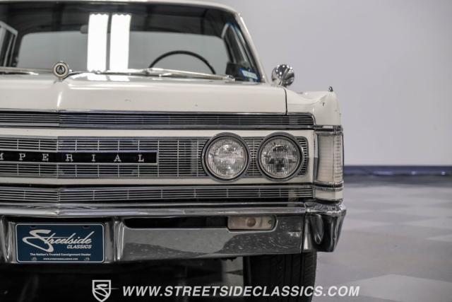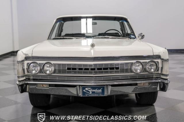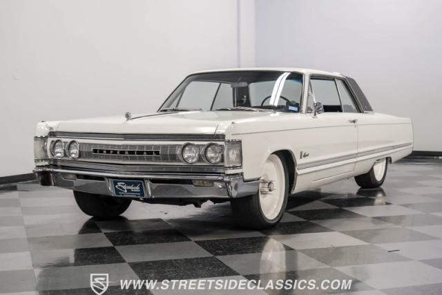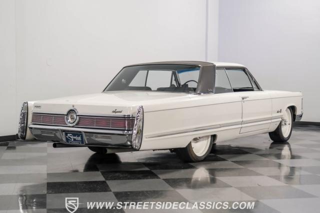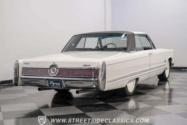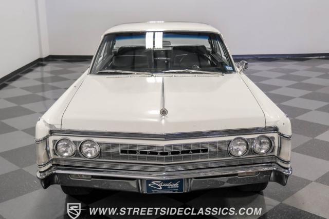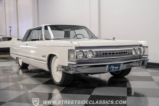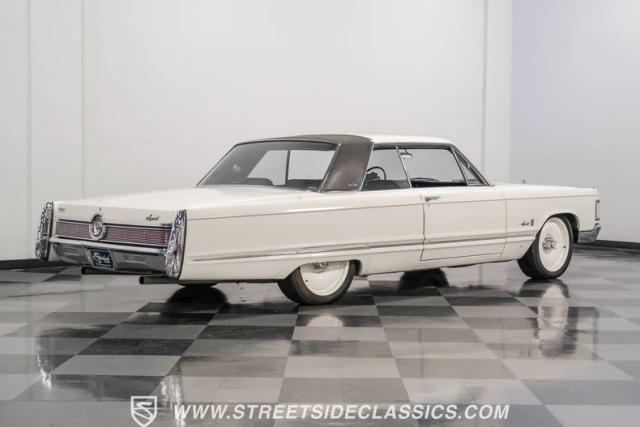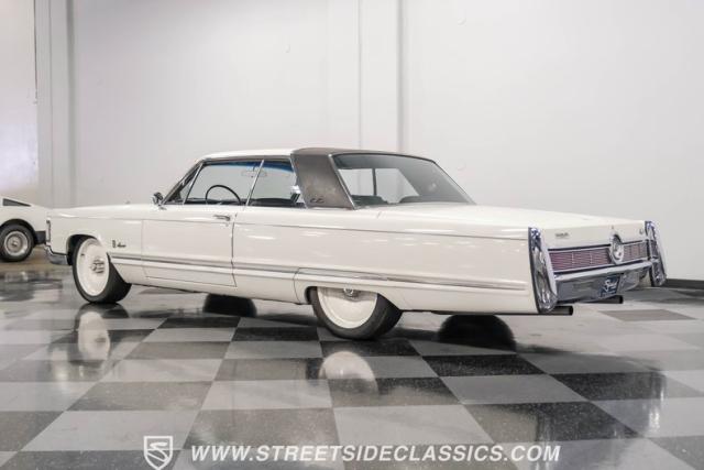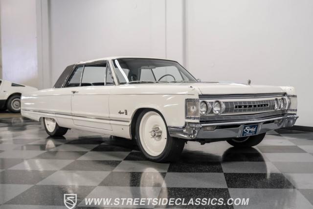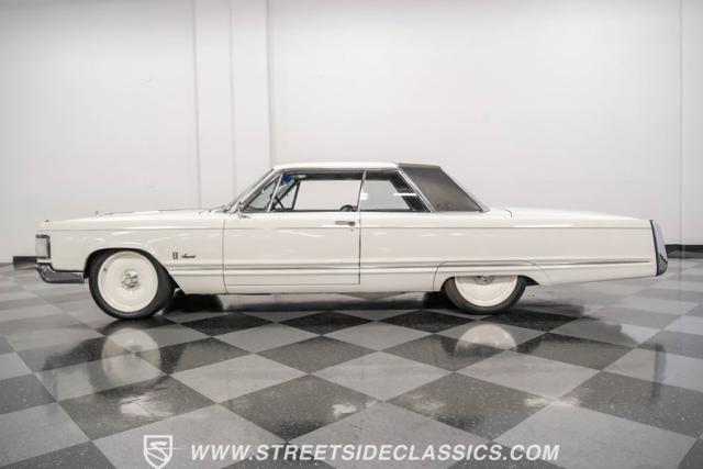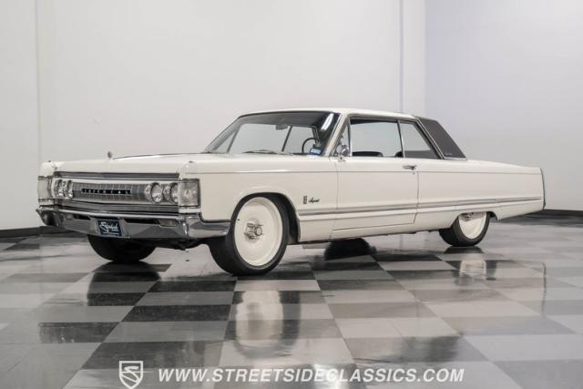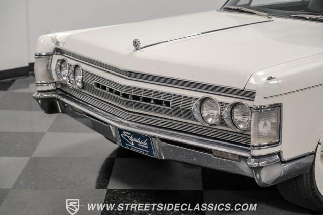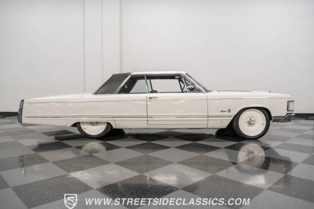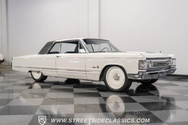 This 1967 Chrysler Imperial Crown coupe commands respect in Persian White. The sleek silhouette stretches over 18 feet, showcasing the pinnacle of American luxury. Chrome accents and crisp lines define its regal presence, while 20-inch wheels wrapped in 245/50R20 tires provide a modern stance. The vinyl roof adds a touch of class, complementing the Imperial\'s stately profile.