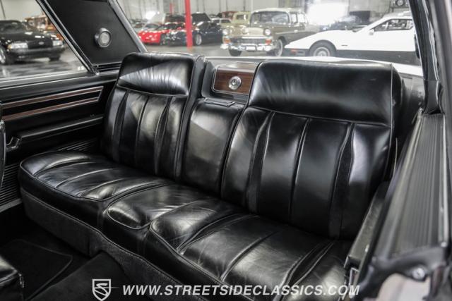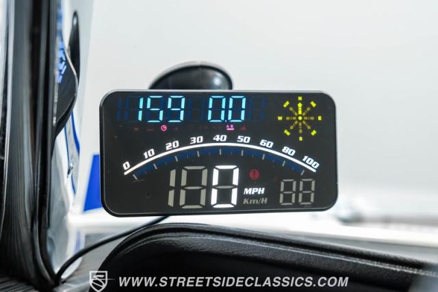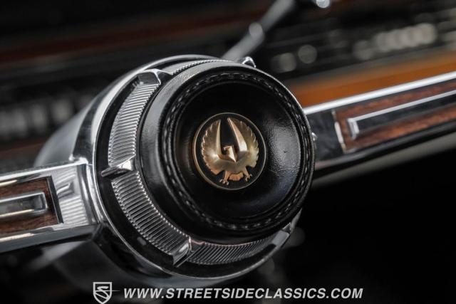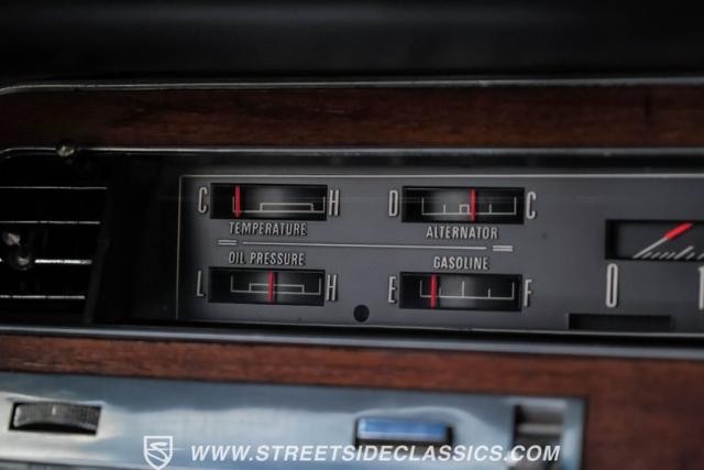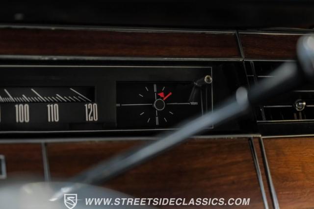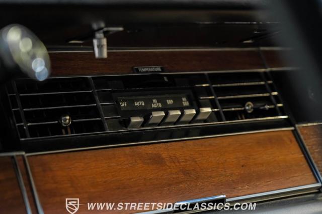Black leather envelops the cabin, offering a stark contrast to the exterior. Power bucket seats with a folding armrest provide comfort for long cruises. The dashboard, adorned with chrome and wood accents, houses essential gauges and controls. A telescopic steering column and power accessories enhance the driving experience. The digital speedometer adds a subtle modern touch to the classic interior.