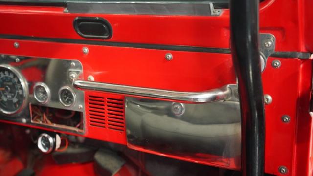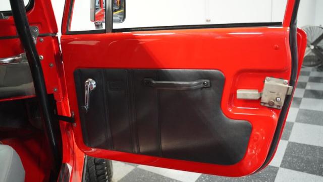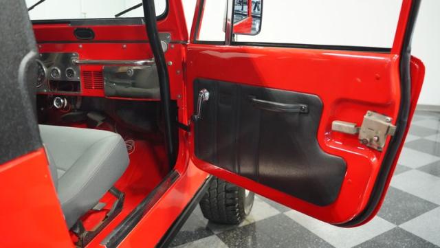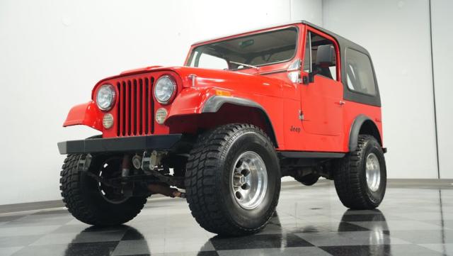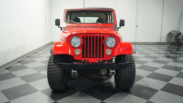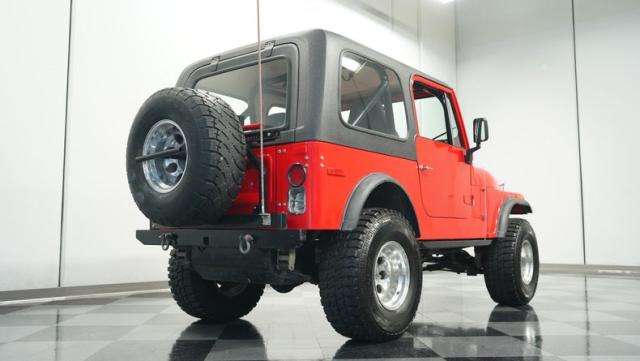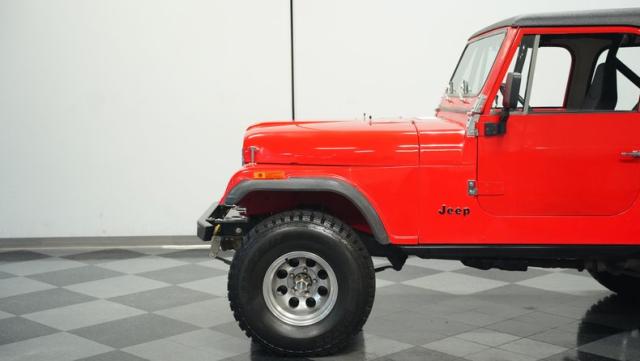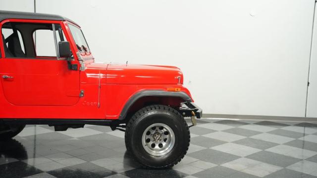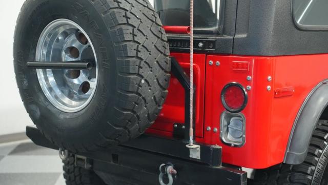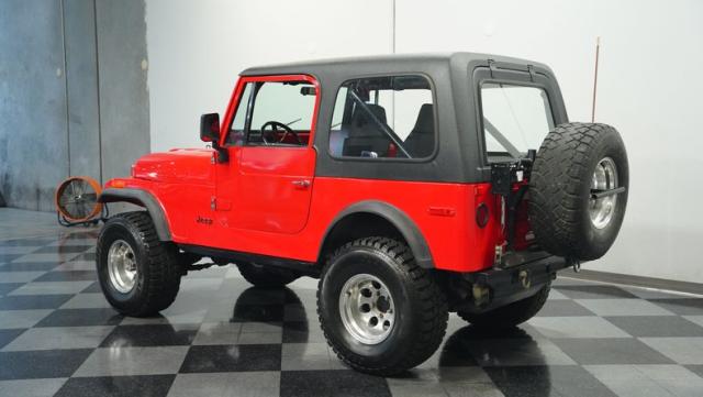 Built for pure off-road action, this 1980 Jeep CJ7 rises above the rest with its Cardinal Red exterior and beefy stance. Custom 15-inch wheels provide the foundation for massive 33/12.50/15 all-terrain tires that establish unmatched ground clearance. The LED taillights and rhino-lined fiberglass top create a tough-as-nails appearance, while the upgraded roll cage system reinforces the CJ7\'s off-road credentials. The wide-body design and elevated stance make this Jeep an authentic off-road machine.