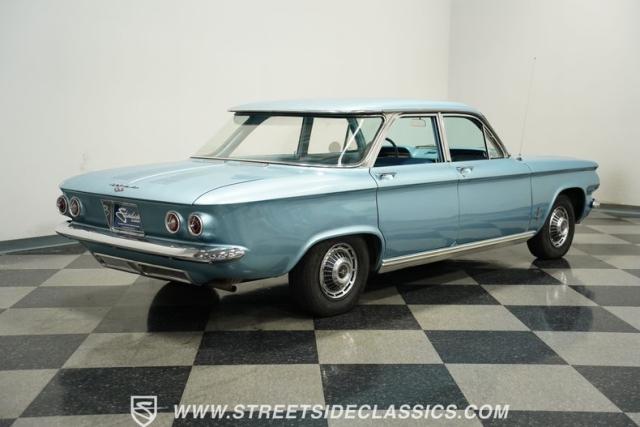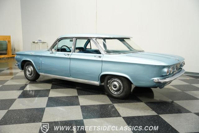 Air-cooled engineering meets compact design in this 1963 Chevrolet Corvair Monza, finished in Silver Blue paint that reflects Chevrolet\'s bold approach to alternative powerplant placement. Four doors provide access while maintaining the Corvair\'s distinctive profile, with 13\" wheels supporting 185/70R13 tires at all four corners. The single exhaust system exits cleanly, and the repainted exterior shows the attention given to refresh this unique General Motors design that dared to be different from Detroit\'s conventional offerings.