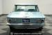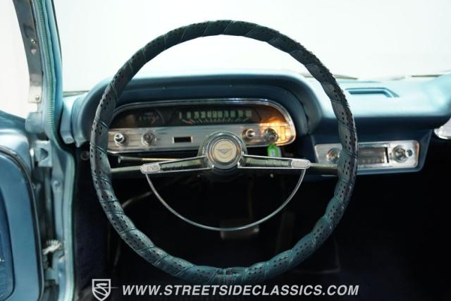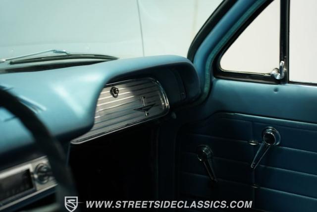 Blue vinyl interior creates a coordinated environment with the exterior finish, featuring bench seating that accommodates passengers in period-correct comfort. The dash-mounted shifter controls the Powerglide transmission while the AM radio provides entertainment. Power brakes assist stopping duties, and seatbelts add safety considerations. The vinyl surfaces and interior trim maintain the factory aesthetic that made these Corvairs popular with buyers seeking something beyond the ordinary sedan configuration.