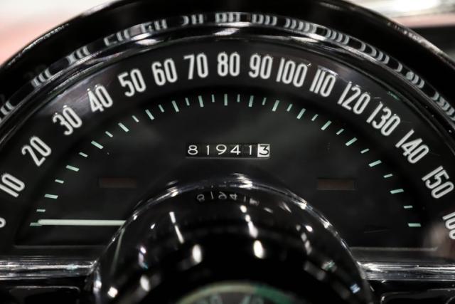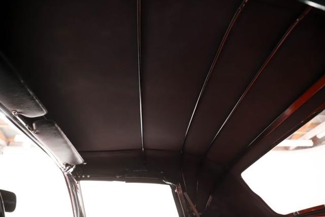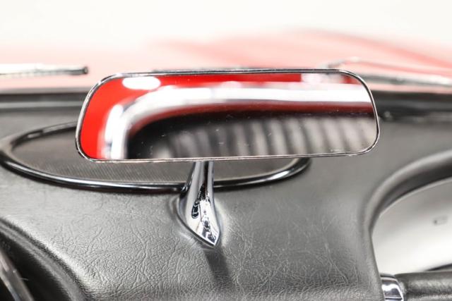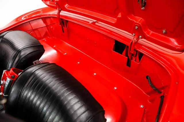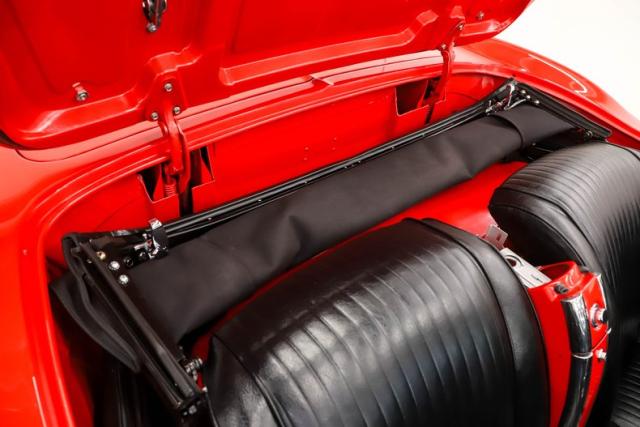 EXTERIOR: Far better fit and finish than it had when it was new! Striking Roman Red paint is smooth and slick to the touch, shiny and sexy to the eye. It\'s a paint job to be very proud of. Looking down the side of the body it is amazingly straight with smooth contours and crisp lines. The panels have all been nicely aligned with great gaps that are well above average. The doors close easily with minimal effort. The bumpers have been rechromed and the remaining brightwork all has a glorious shine. The glass has been replaced as well as the rubber seals and fuzzy strips. The black convertible top looks brand new, and the top frame totally restored. The convertible top lid closes precisely with a solid thud. It\'s rolling on 15\" steel rims adorned with sweet spinner hubcaps that are in amazing condition. The reproduction Firestone whitewall tires are also in great shape.