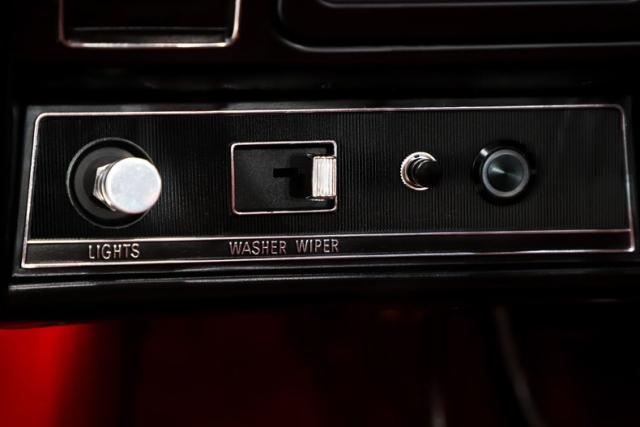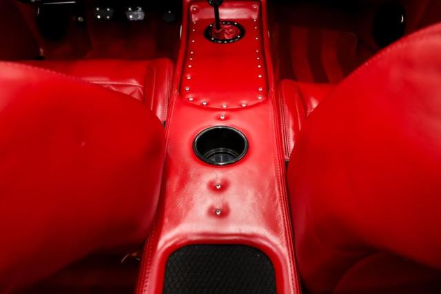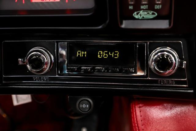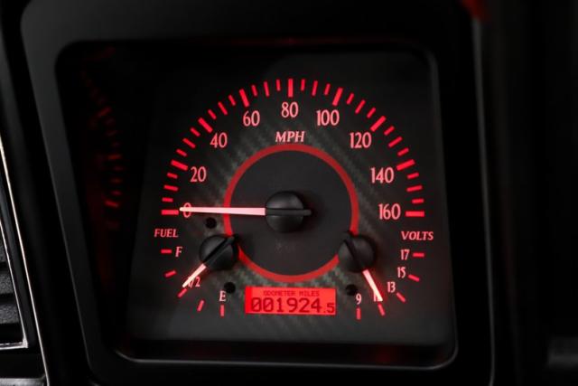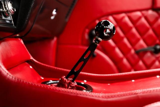 INTERIOR: Wow, this is worthy of being in a high-end luxury car! This is all genuine leather on everything from the seats to the dash pad. It has four custom bucket seats, both front seats are power. Custom made side panels are upholstered to match the seats and have Billet handles and red LED lights built in. The custom center console extends front to back and is also wrapped in leather; it includes speakers, a cup holder, interior lights and the real cool looking five speed shifter. Custom cut carpet and mats are on the floor. It is upgraded with Dakota Digital gauges that light up red. Vintage Air electric slide control panel replaced the old cables. The retro stereo has speakers in the kick panels which are also wrapped in leather. A chrome tilt column has a Billet Specialties steering wheel. It also has custom pedals, complete new wire harness and fuse block. It is first class!