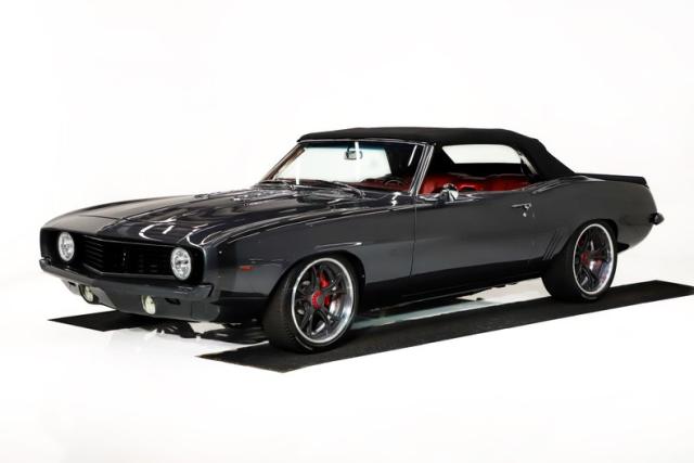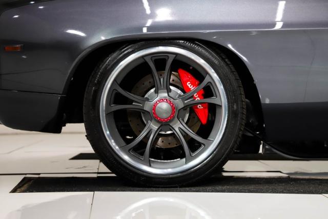 EXTERIOR: Professional body and paintwork by Rotisserie Restorations. The body panels are completely straight fit nicely, I don\'t see any rust or damage. It has the SS hood and rear spoiler. Painted a rich charcoal gray metallic which is laid out evenly and the clear coat is polished beautifully. It has color keyed smooth bumpers, marker lights and convertible top opening molding. The hockey stick stripe is painted two shades darker and smooth to the touch. It has an upgraded rich black canvas convertible top. The weatherstrips were replaced. It has Halo LED headlights and LED tail lights. 18 & 19 inch Schott Tomahawk center lock wheels are wrapped in performance Bridgestone wheels.