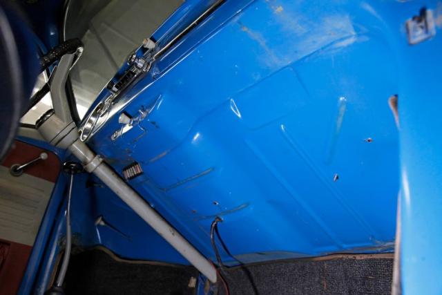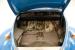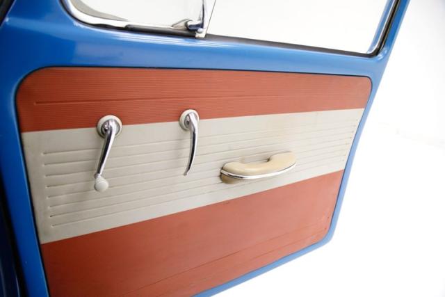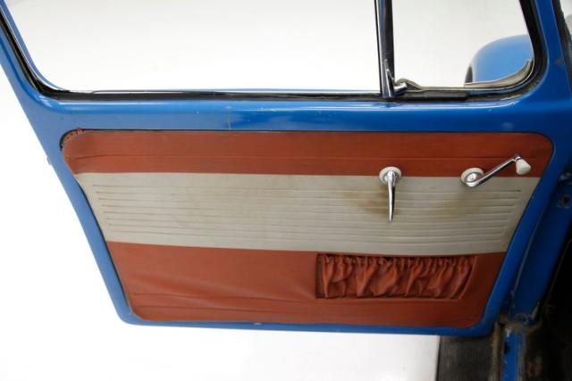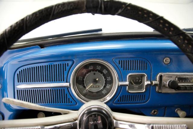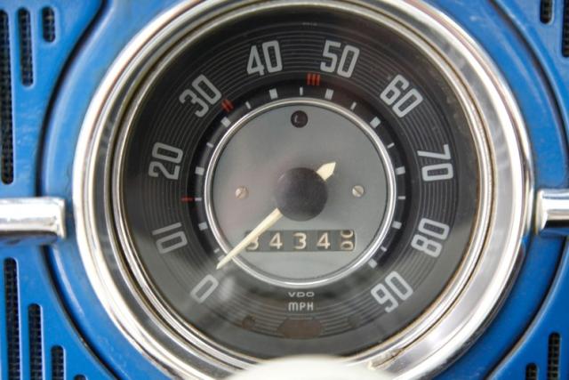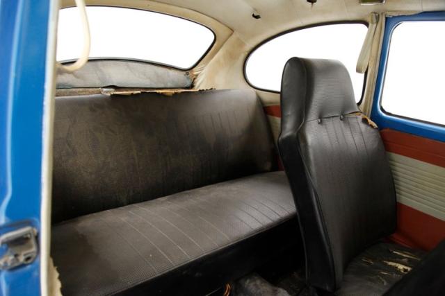 A swing of the door and we see blue metal painted surrounding a gray and red horizontally ribbed alternating color vinyl panel complete with the door handle, window crank, and a vinyl armrest. Black vinyl VW high back bucket seats are in front and the drivers seat has lots of tears and shows the padding beneath the vinyl. A simple rear seat is a long bench and stretches from C pillar to C pillar. This also has some damage in its top ledge. Black stippled rubber is on the floors, and some rubber protective mats are above. A simple blue full metal jacket painted dash with circular speedometer and square gas gauge sit within the vertical ribbed speaker area which is fronted by an original steering wheel in good condition with the Castle Wolfsburg logo in the center of the half round chrome horn ring. An AM radio is also mounted in the dash and fits nicely although may not be original to this car. The headliner is white, is nice and tight and shows some smudging and dirt areas as well as a tear.