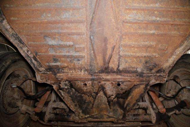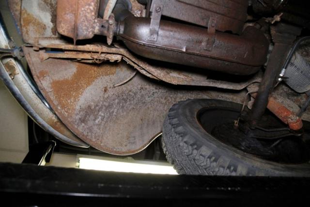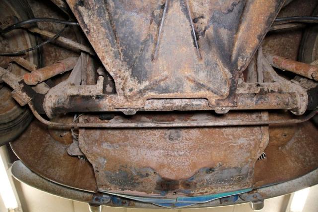 Moderate to heavy surface rust is attaching itself to all the various parts on the undercarriage. Steel stamped floor pans have just a few holes of invasive rust. For the suspension, itshows as independent transverse torsion bars upfront, and independent swing axle trailing arm with torsion bars on the rear. Drum brakes are on all 4 corners to bring this bug to a safe and stable halt. All are surface rusted.
