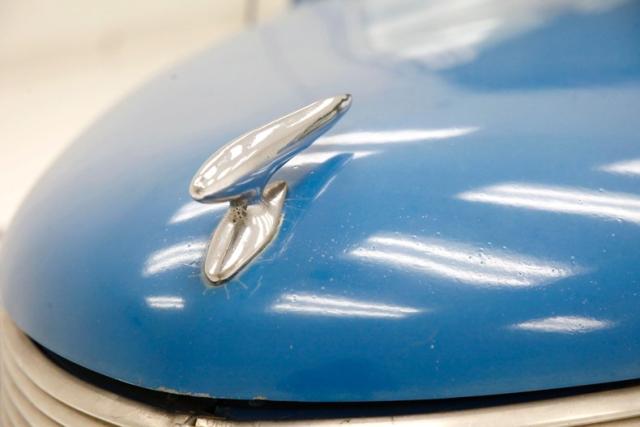 I\'m blue blue blue says this touch of class with this Beetle and that paint that adorns the curved steel paneled Beetle shaped V-dub. Only minor inclusions are apparent in the finish, but one really has to look to find them. The chrome is nicely preserved in the bumpers, trim, and any badging which shines wonderfully in the strong Pennsylvania summer sun. The gaps are very nice, and the cute little running board is all solid. Highlights would be for this writer the swooping beltline molding on either side of the car which has a great line, the addition of chrome bumper overriders or bed rails if you will, and the twin chromed mini exhaust tips that peek out from under the curved bumper... but the highlighter is of course the vintage vertical grille and modded hood. Gone is the rounded look now replaced by a ling 1930\'s-esque hood college with an \"aero\" Art Deco hood ornament. Fancy schmancy to say the least. Looking good for this buggy comeArt Deco inspired roadster.