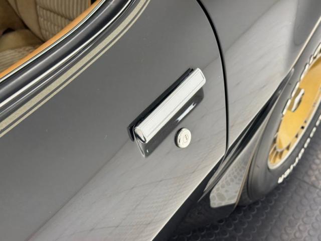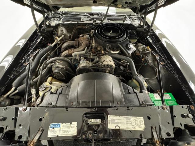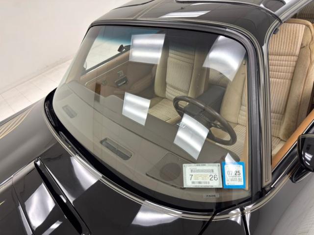 Code 19, Starlite Black, bathes the exterior of this racy looking car. It will stand out in a crowd with a gold screaming chicken decal, two color, (gold and tan), decal badging, and gold turbine styled wheels. All fender flaring, neoprene bumpers matching the body black and a rear spoiler look to be in top notch condition with nearly no flaws in the finish and certainly no rust. Side vents can be seen on the front quarters, and a chin spoiler is just below the gold stripe highlighted black grilles.The back is more racy with the rear spoiler and ribbed black horizontal bar panel to use the taillights.Another deep end of the pool black neoprene bumper is hanging on the bottom.Up top it features black smoked glass for the removable \"T\" top and all trimmings for the side windows are in black and highlighted in gold.The gold from the hood decal encompasses the A pillars and moves to the top. A turbo hood, with lighting on the back of the scoop to indicate boost levels hovers above the quad of headlights and has the Turbo 4.9 decaling.Some gold pinstriping also shows up and offers up some nice highlighting to the gold and tan tones on the black.