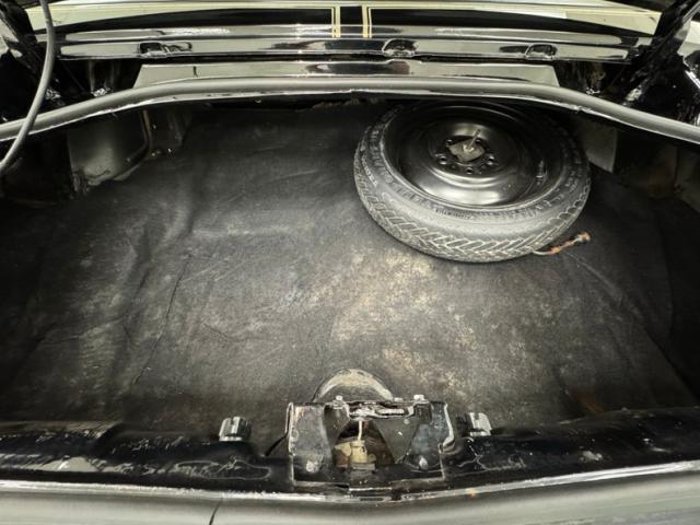 Light Doeskin is the color motif for the interior chosen and is the perfect compliment to the black.Swinging the long doors and getting past the Doeskin colored vinyl door panels are showing a side view mirror toggle, power lock actuator, and some thinshiny trimmings we are greeted with high back buckets in front and a 2 plus 2 bench for the back.These are covered in broadcloth in light tan with some vertical striping and shallow tuck and roll inserts.The bolsters are a smooth, slightly darker Doeskin and all is looking just fab.A chocolate brown console shoots forward between the buckets and houses a glovebox, power window switches, and shift lever.As it rises it meets the circle machined pattern aluminum dash that houses black faced original gauges all held within a crack free chocolate brown padded dash.There are plenty of them as well, all in circle form, even a factory tachometer, and a clock is seen on drivers left.Air conditioning, a multitude of gauges, a see through roof, power windows, tilt steering wheel, AM/FM/CD stereo, and rear window defogger.What more could you want? Oh, I know, read on!