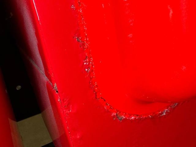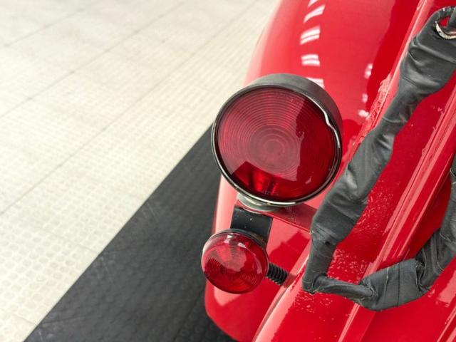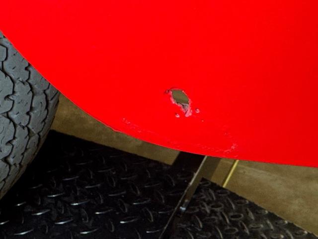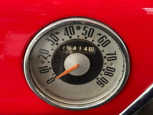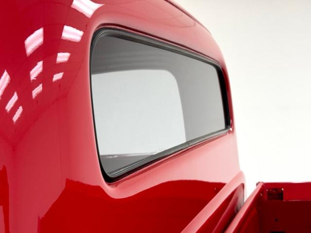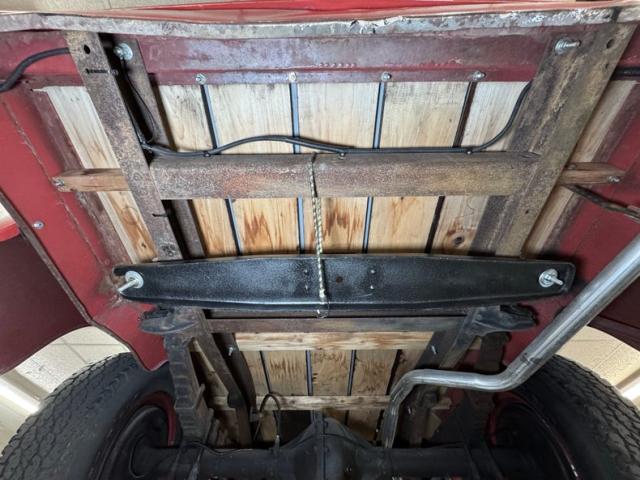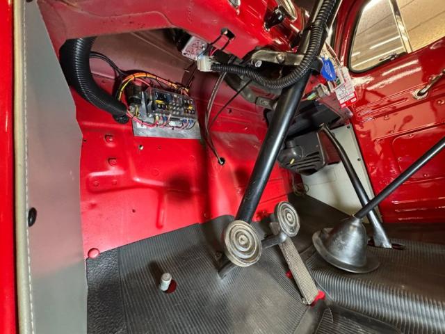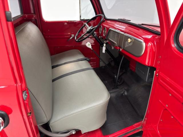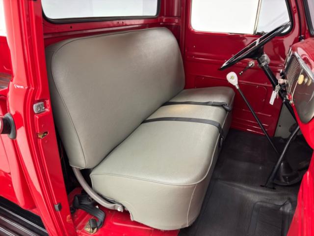 Bring your wax inside because the inner doors are body colored steel only with visible fasteners and clean hardware. A gray grain vinyl bench is simple and clean and in great shape, facing a vintage steering wheel and an original looking dashboard with its lip gloss red background. The shifter that rises from the floor is topped by a Stouts Brewing Company tap handle and along with the hand brake rises from a rubber coated floor. Gray vinyl panels line the footwells but the headliner is red steel with the dome\'s lights wiring taped into place and a single sun visor is afforded to the driver.