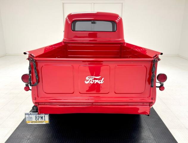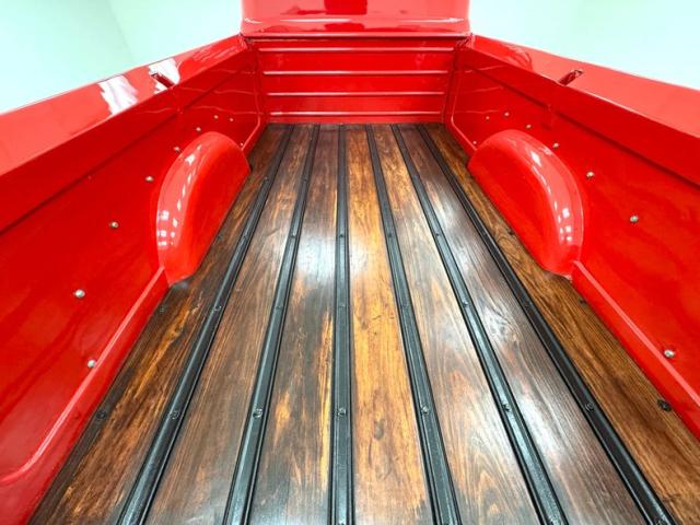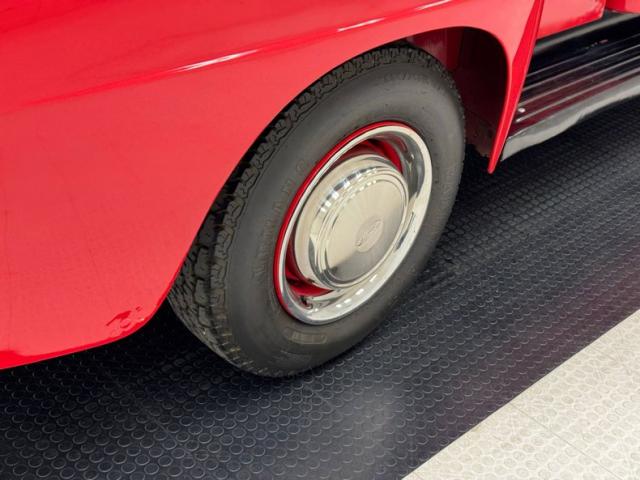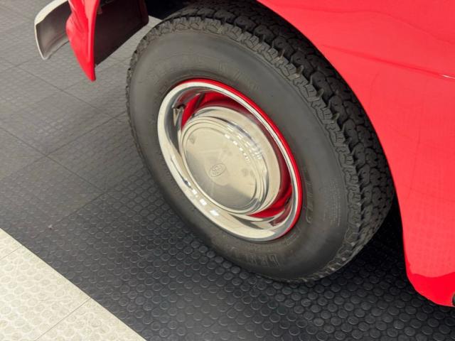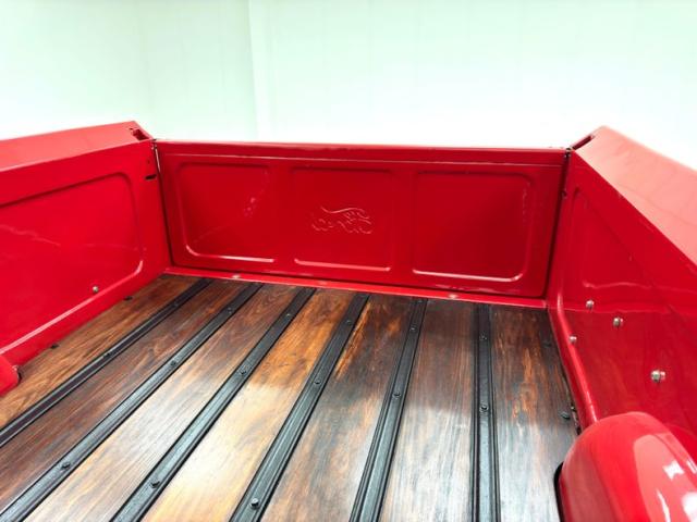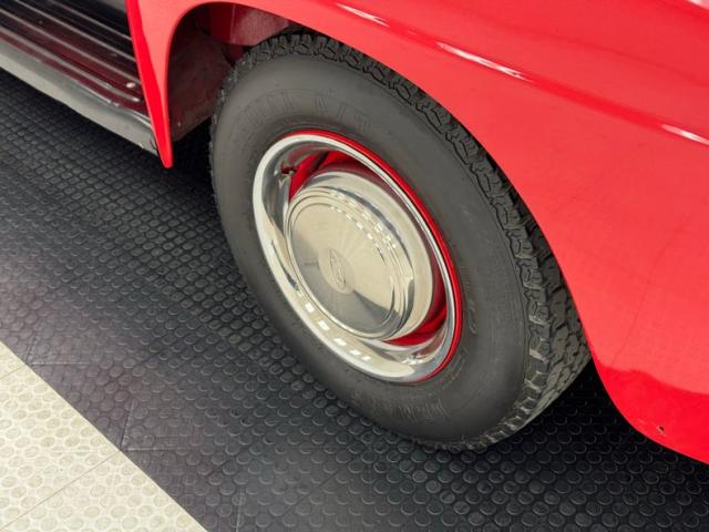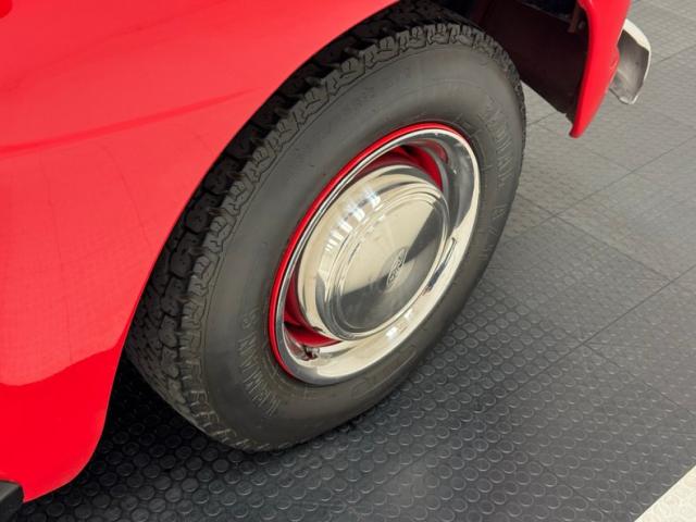 Gleaming like a Christmas aleigh, this ton truck wears a two stage coat of Carnival Red and when coupled with the robust, ivory painted grille, presents as the perfect model for your next holiday postcard. Light rings and the front bumper glisten like tinsel on a tree with very nice chrome while the hood spear over the vents adds some side shine. Ford pops off the tailgate in white paint back when brand call outs were small, if present at all, compared to today\'s Ford where the letter stretch across the grille and tailgate. 16-inch wheels are painted to match and have vintage dog dish hubcaps and trim rings, wrapped in LT rated tires. The bed boards have been refinished highlighting dark grains between black painted rails. Some blistering is noted in spots and a chip, but otherwise paint and trim are in great shape.