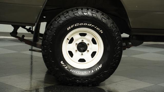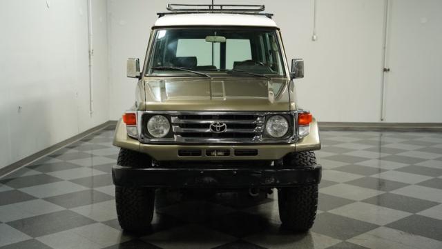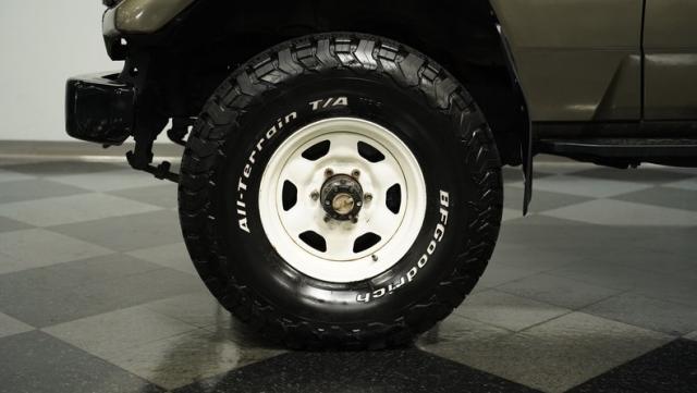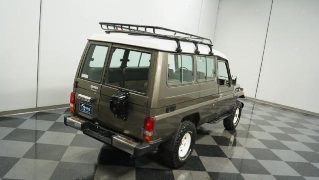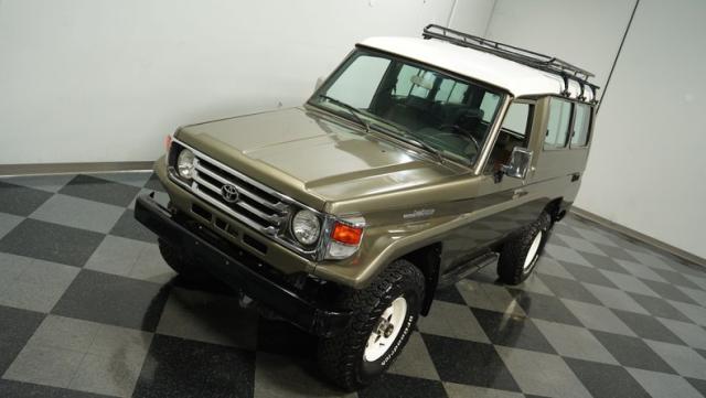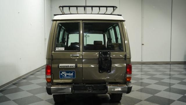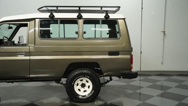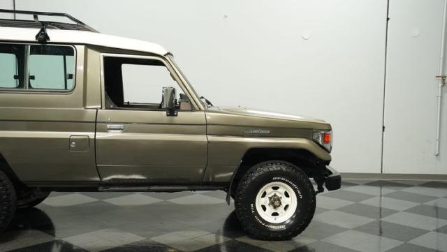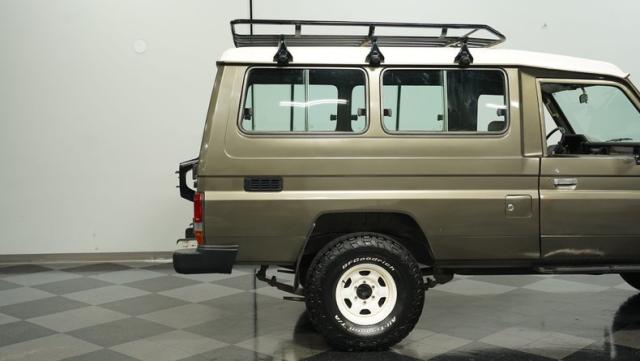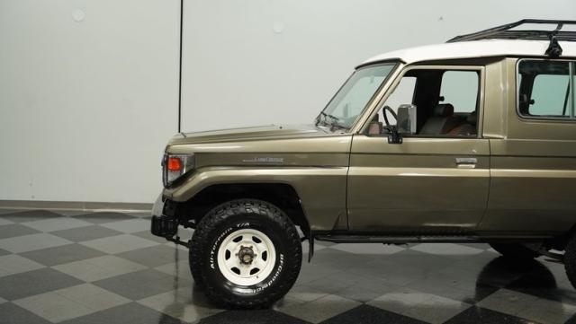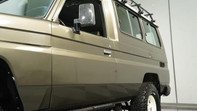 Embark on epic adventures with this 1990 Toyota Land Cruiser FJ75 Troopy! Its classic bronze metallic paint over a white roof hints at a rich history of exploration. This rare long-wheelbase \"Troopy\" boasts a distinctive silhouette and the legendary off-road prowess that Land Cruisers are known for. The aggressive 33x10.50R15 tires, mounted on classic 15-inch wheels, complete the rugged look.