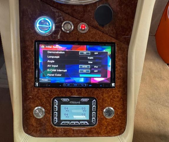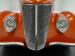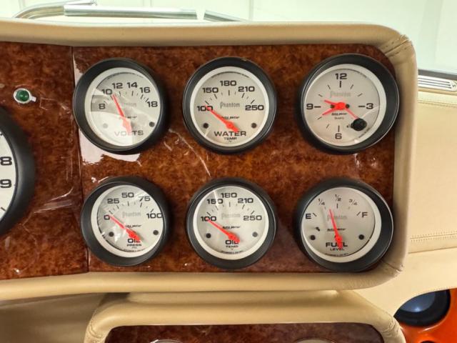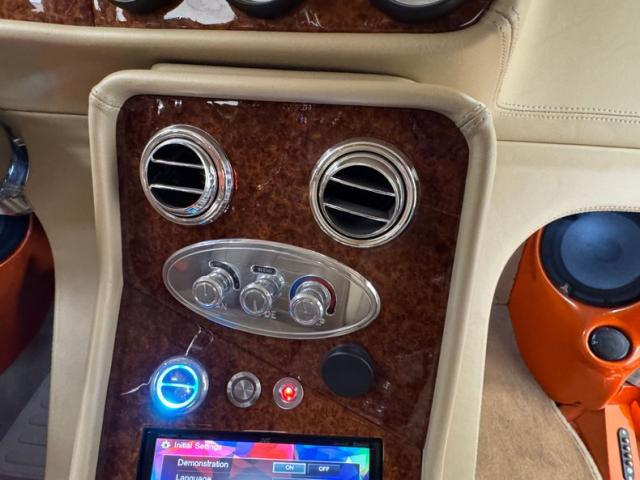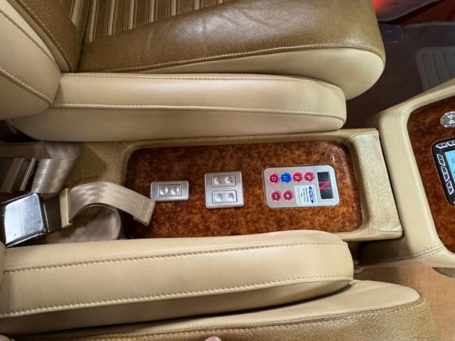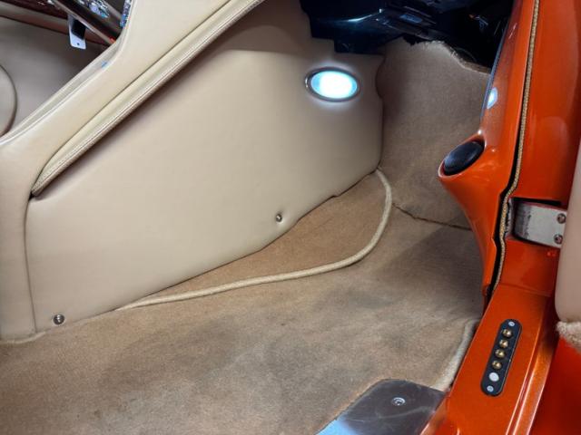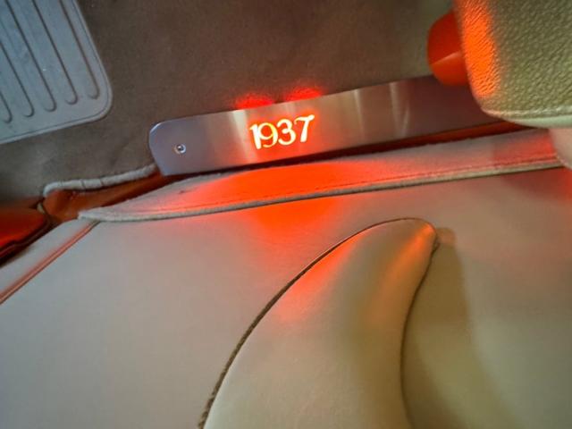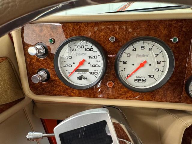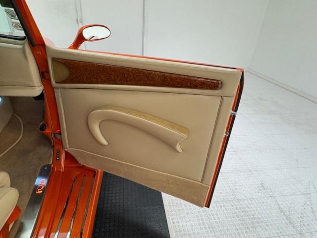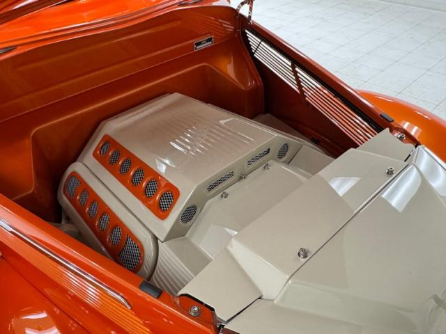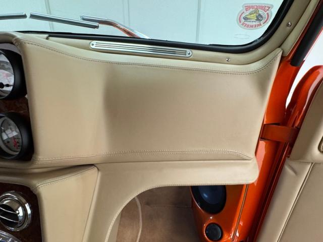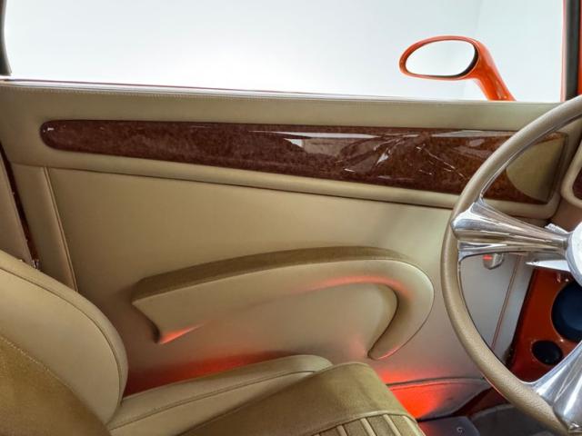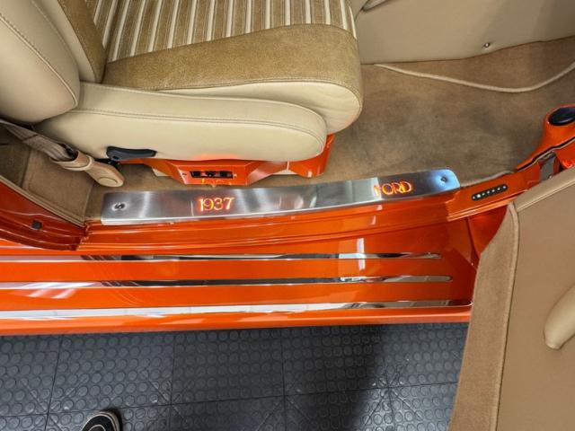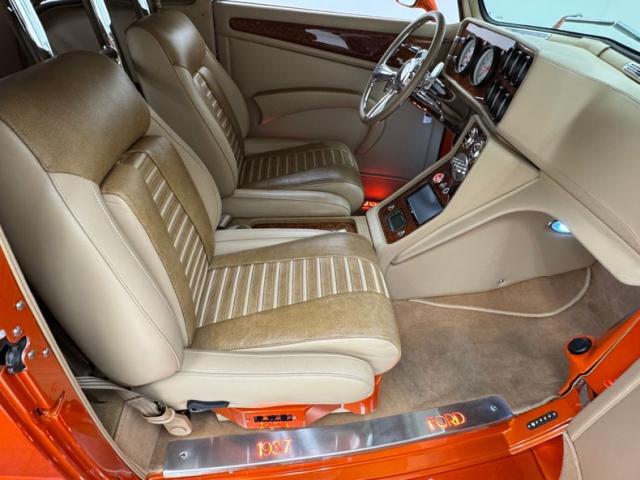 If you think the outside shines, wait until you see the features here where the palette of tan leather and burlwood trim start on the doors with custom shaped armrests and tight, carpeted lowers and the 1937 Ford illumination on the sills is a nice touch. Low back leather bucket seats are two tone, with a snake belly type pattern down the center and both seats present cleanly and backed by a chrome styling bar. There\'s more reflective metal on the steering wheel spokes while the rim is in matching tan leading to the wood faced dash with white faced AutoMeter gauges with six arranged symmetrically to the right. It\'s more like 2037 in the center stack where a billet panel controls the A/C and digital lights, a pair of screens provide various points of information, and the push button transmission is clean and colorful, all in wood and stitched leather. Trimmed carpet pieces of fine tan pile cover the floor and finish the trunk and while the footwells show some use, it\'s all fully intact.