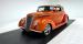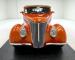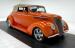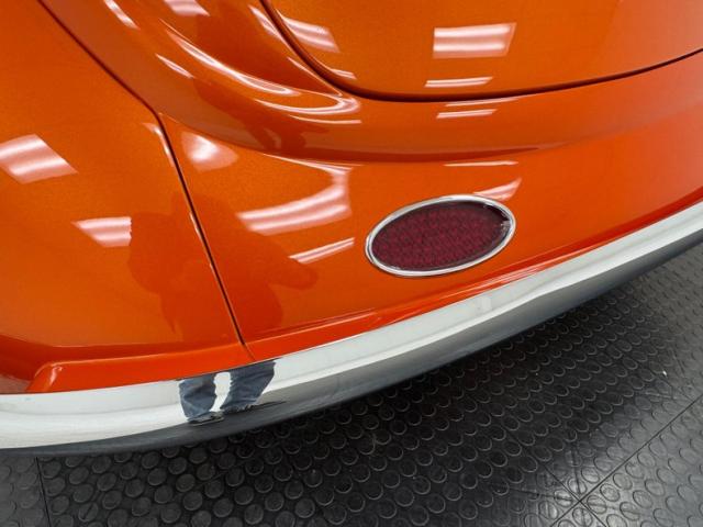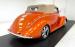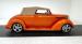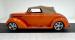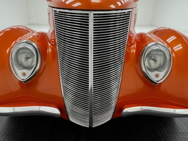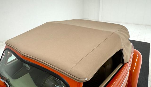 Poised for show and hunkered down on a set of fantastic Foose wheels, this Orange Tricolor cab is a smooth operator and is led by a tall chrome grille flanked by a set of flush, teardrop headlights and fenders that sports a subtle pointed edge. Hood vents cut through the surface, arranged like a Gillette Proglide and topped with polished trim that follows along the shoulder line and the sloping orange rump, helping define the shape in profile. You\'ll note a trim chrome bumper out back and flush oval tail lights, but it\'s the pinstripe flourish that provides the ornamentation and it\'s quite elaborate. The tan canvas convertible top is in nice condition and the entire exterior is devoid of imperfections.