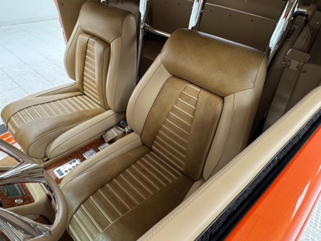 The show must go on, and it does underneath where glossy orange paint mixes with polished metal components that warrant undercarriage mirrors to be brought to the show, without a doubt. No grease, no dirt, no rust, it\'s as showy as the topside. Here we have power disc brakes on all four wheels and dual exhaust that comes from headers into MagnaFlow mufflers and terminates in the back with chrome tips. Suspension consists of a Mustang II front end with air bags and a 4 link with airbags in back. The driveshaft, pumpkin and frame are among the orange painted items and parts of the rear axle and differential cover are reflective chrome.