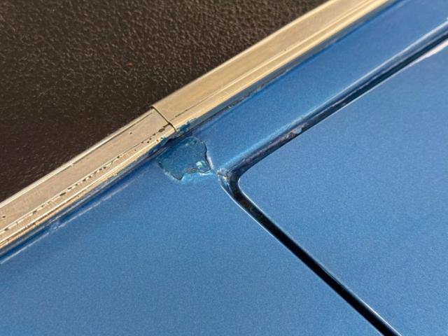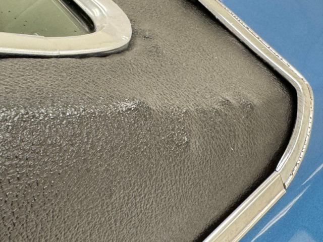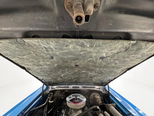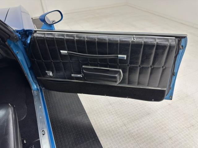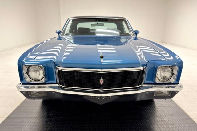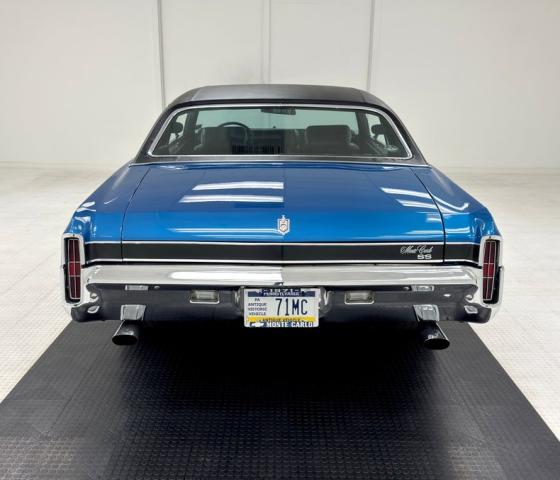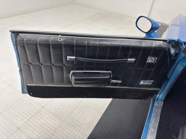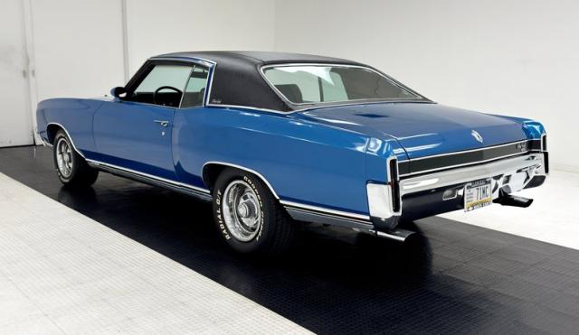 Fourteen colors were available for the Monte in 1971, and this one is bathed in two stage Mulsanne Blue which was applied just over a year ago. In the center of the grated black grille is the Corinthian helmet, (similar to the Spartan helmet), and flanked by single round headlights with rounded cornered bezels. The black vinyl top is in great condition and retains a border of blue around the front and sides, set back from the metal window frame and having a frame of its own. The chrome bumpers, door handles, side mirror, and other metal trim are in excellent shape and the 15-inch Chevrolet Rally wheels need nothing. Simple vertical tail lights are distinctive and canted forward, a field mark that eliminates confusion with any other car while the reverse lights and front parking lights are integrated into the chrome bumpers. Imperfections include some inconsistent black on the grille, some fading of the silver coating on the Monte Carlo emblem out back, chipping paint near the wrap around bumper, bubbling near a gap line, rusting and chipping or bubbling paint below the rocker panel, bubbling under the vinyl top on a window trim edge, numerous areas of bubbling under the vinyl top at the C-pillars and trailing edges.