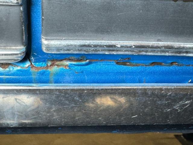 Generally clean and driver quality underneath with some of the typical surface rust and very little dampness of any kind. The polished rear differential cover is cool, but could use a replacement due to some pitting rust spots. Dual exhaust comes off the headers and runs the length before entering a pair of FlowMaster mufflers, then exiting out chrome oval tips in back. Coil spring suspension in front is matched with a 4 link with coils in the rear.