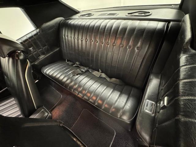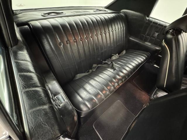 Black vinyl patterned door panels on both doors present in excellent condition with a black armrest and door pull with silver accents blending with the silver window crank, the driver\'s door showing some wear on the kick panel. Bucket seats continue the pattern of black vinyl stitched and button back design in very nice condition. The back bench continues the seat theme of near showroom condition. The 4 spoke steering wheel is also in great shape and leads to a flow of burlwood applique which rides over the dashboard where gauges are neatly arranged with some typical fading of the silver painted edge. A Sharp AM/FM/Cassette radio is in the dash below the climate controls topped by a pair of vents, followed by a triple gauge pod mounted under the dash. The always enjoyable horseshoe shifter lives in the center console with large indicator numbers on the face framed in more simulated wood. Black loop carpet covers the floor and is protected by carpeted mats embroidered with Monte Carlo SS, and the black headliner with shoulder belts look factory fresh. A black rubber is in the otherwise bare trunk along with a covered spare tire.