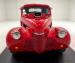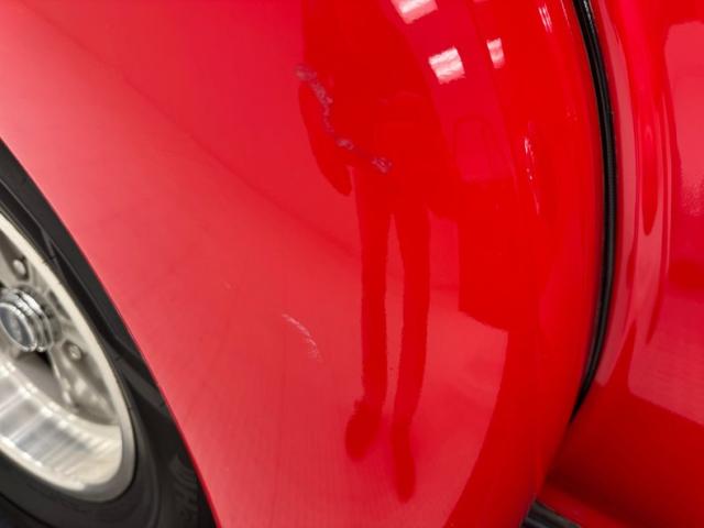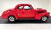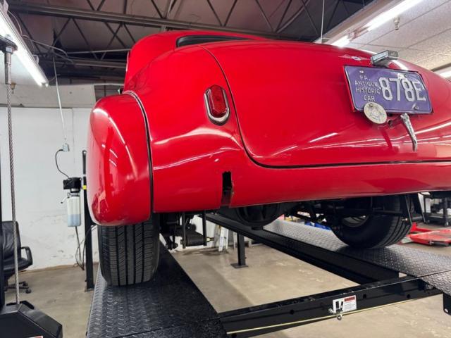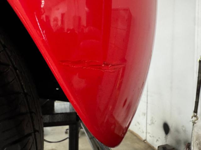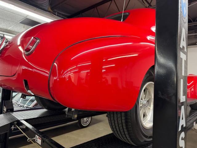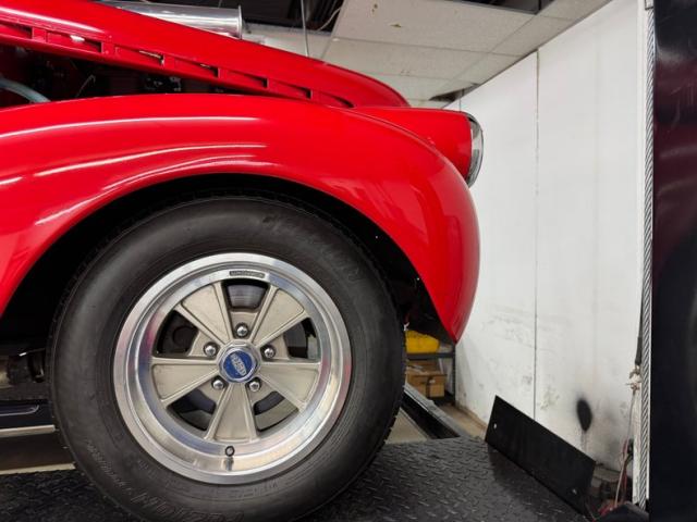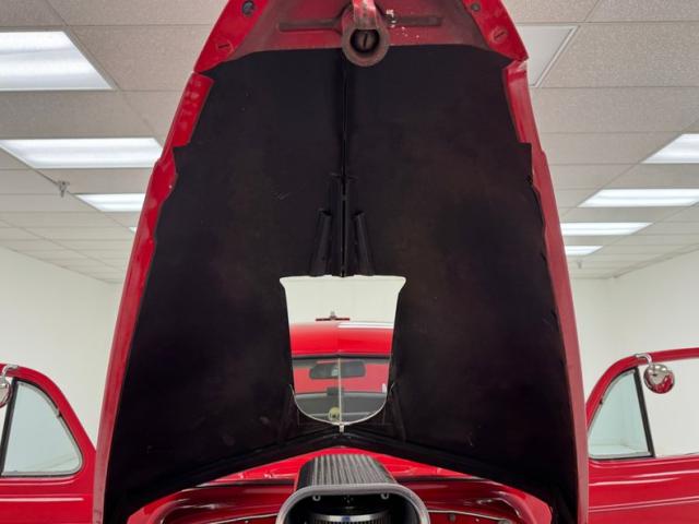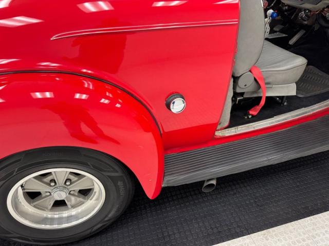 Eye searing Rally Red will get your attention just before you hear the roar of the Deluxe turn the corner, and the bumper delete aspect of the car creates a wind defying profile which seems to cant forward in movement even when parked. Articulated fenders reach broadly beyond the body, arching over 15-inch Cragar wheels that look just right while a hood scoop emerges from the hood, jutting forward in the same attitude of the protruding headlights. The slanted B-pillar follows the lines of the business coupe\'s rear and whether the designers intended it or not, it\'s a well balanced design that works well with the slightly raked stance presented here. Imperfections are few, with some touched up and untouched chips, scuffs, running boards showing some age, paint blistering, uneven gaps with cracking paint where the bumpers would be on the apron, and some evident filler flaws.