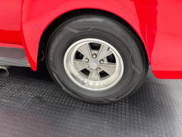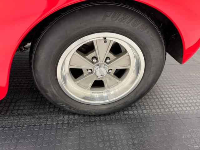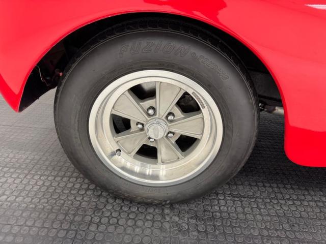 Gray cloth door panels retain the petite hardware associated with period cars and show some light staining but are fully intact and handsome. Gray vinyl ProCar reclining bucket seats occupy the cabin with race style lap belts in red and the package shelf behind them is configured as if a rear bench seat, with gray cloth and red inserts, clean and attractive. A red leather wrapped chrome spoked steering wheel on a tilt column fronts a dash with modern, digital gauges and a Captain America Moon Equipped tachometer perched on top. You\'ll also have the modern convenience of an AM/FM/CD radio with Aux and USB connectivity and a VintageAir unit. Red, white and blue color the mean looking Kilduff Lightning Rod shifter, three sticks that look like something out of the NHRA! It\'s over black carpet and under a gray headliner, both in great shape. The trunk is barren, bare metal and currently houses an Optima yellow top battery.